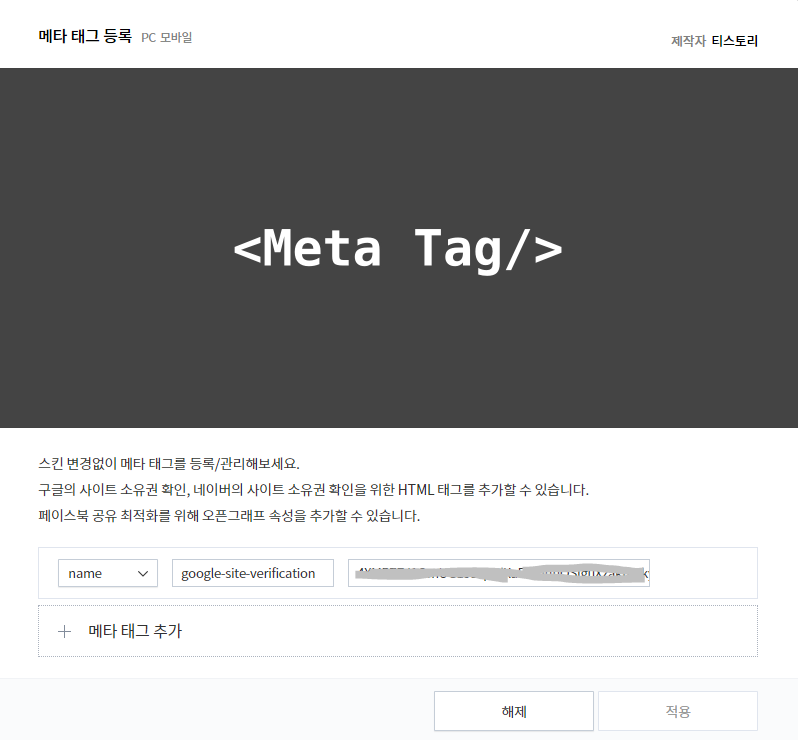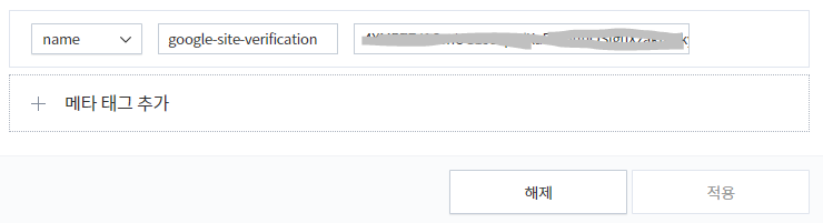 위의 이미지 처럼 첫 칸은 <name>로 두시고 그다음 빈칸에 "google-site-verification"을 넣어줍니다. 그리고 마지막 빈칸에 아까 위에서 보셨던 content="<이 부분>"의 <이 부분> 내용을 넣어주시면 됩니다.