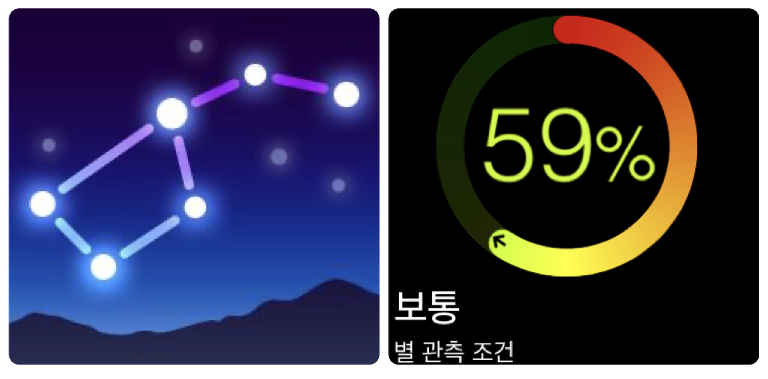다음은 별자리에 대한 정보를 찾아볼 수 있는 스카이 워크 2입니다. 아이폰 어플로도 좋지만 애플워치와도 연동이 됩니다. 다만 나이트 스카이처럼 별자리를 직접 보여주지는 않습니다. 별자리를 볼 수 있는 환경이 얼마나 좋은지를 찾아볼 수 있는데요. 달이 밝거나 대기질이 좋지 않으면 밤이 되도 별자리를 직접 찾아보기 쉽지 않습니다. 스타 워크는 오늘 별자리를 보기에 환경이 얼마나 좋은지를 알려주는 기능이 있습니다. 또한 주요 행성들의 일출 일몰 시간이 나와서 언제 화성, 수성, 목성, 토성 등을 찾을 수 있는지 정보를 워치로 손쉽게 알려줍니다. 나이트 스카이 어플과 스타워크 어플만 있으면 웬만한 별자리는 다 찾을 수 있습니다.