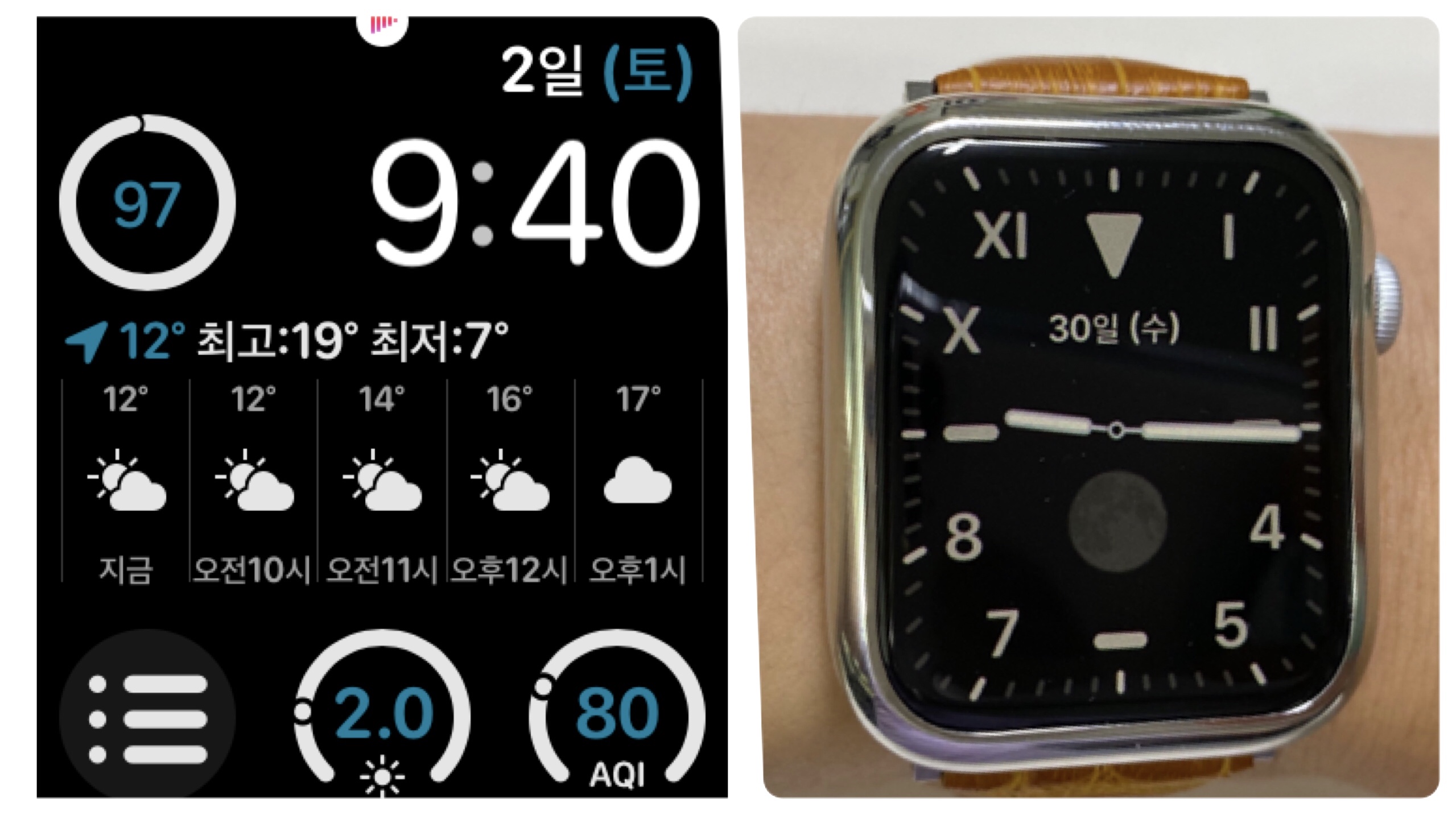 인포그라프 모듈에서는 인포그라프를 지원하는 어플에 한해 표시가 가능합니다. 저는 좌측 상단에 애플워치 배터리 그리고 우측 상단 날짜에 캘린더 그리고 중간에 날씨 하단은 좌측부터 미리알림, 자외선 지수, 공기질을 표시하고 있습니다 상당히 직관적으로 볼 수 있기 때문에 큰 도움이 되고 있죠. 워치 페이스에 대한 이야기는 나중에 시간이 나면 다시 하도록 하고 이제 어떤 어플리케이션을 편리하게 사용하는지 이야기해 보도록 하겠습니다