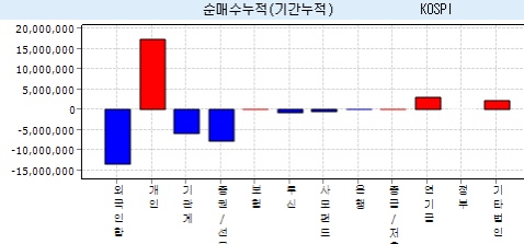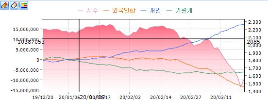 이주가 넘는 기간 동안 외국인과 기관은 순매도를 하고 오로지 개인만 순매수를 하고 있습니다. 증시 개장이래 최대 자금이 주식시장으로 몰리고 있다는 뉴스도 있습니다. 이런 상황에서 저도 남들이 다 말하는 것 처럼 ‘이건 십년에 한 번 올까말까한 일확천금의 기회니 잡아야 한다’ 고 무책임한 말을 하고 싶지는 않습니다. 위 표를 그래프로 쉽게 보면 아래 그래프 처럼 나타나는데요.