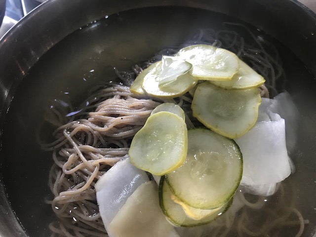 보기에는 다른 평양냉면과 크게 다르지 않습니다. 적당히 끊어지는 평양냉면답게 적당히 끊어지는 면발과 고기 육수 기반의 물냉면입니다. 오이지도 들어가 있기 때문에 오이를 싫어하는 사람은 오이를 걸러내고 먹어야할 듯합니다. 무엇보다 좋았전 점은 고명으로 올라간 삶은 계란 반쪽이 너무 맛있었습니다. 감동란 같은 야들야들하고 부드러운 식감입니다.