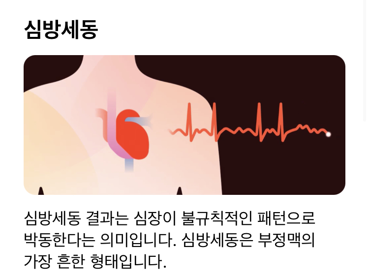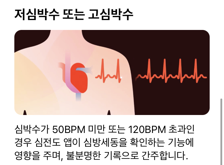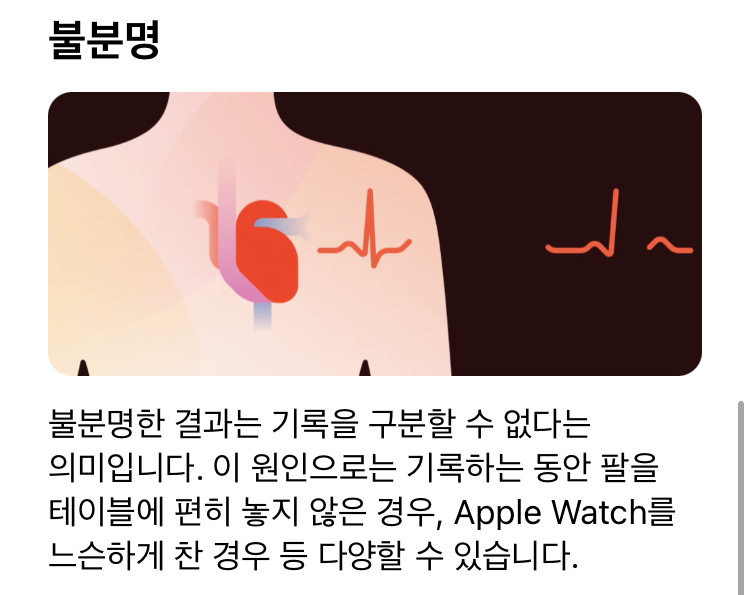 이렇게 측정을 하는 것만으로도 물론 유용할 수 있지만 애플워치는 백그라운드에서 가끔씩 심장리듬을 측정합니다. 부정맥으로 보이는 징후가 있으면 알림을 보내기도 합니다. 물론 모든 측정과 알림은 보조적 수단으로만 활용해야 하겠죠.