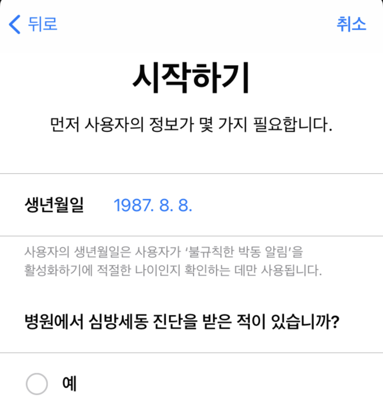아이폰에서 먼저 심전도 관련 설정을 먼저 해줘야합니다. 우선 건강앱을 열고 생년월일을 입력해줍니다. 그리고 심장 건강에 대한 몇가지 사항을 체크하면 끝입니다.