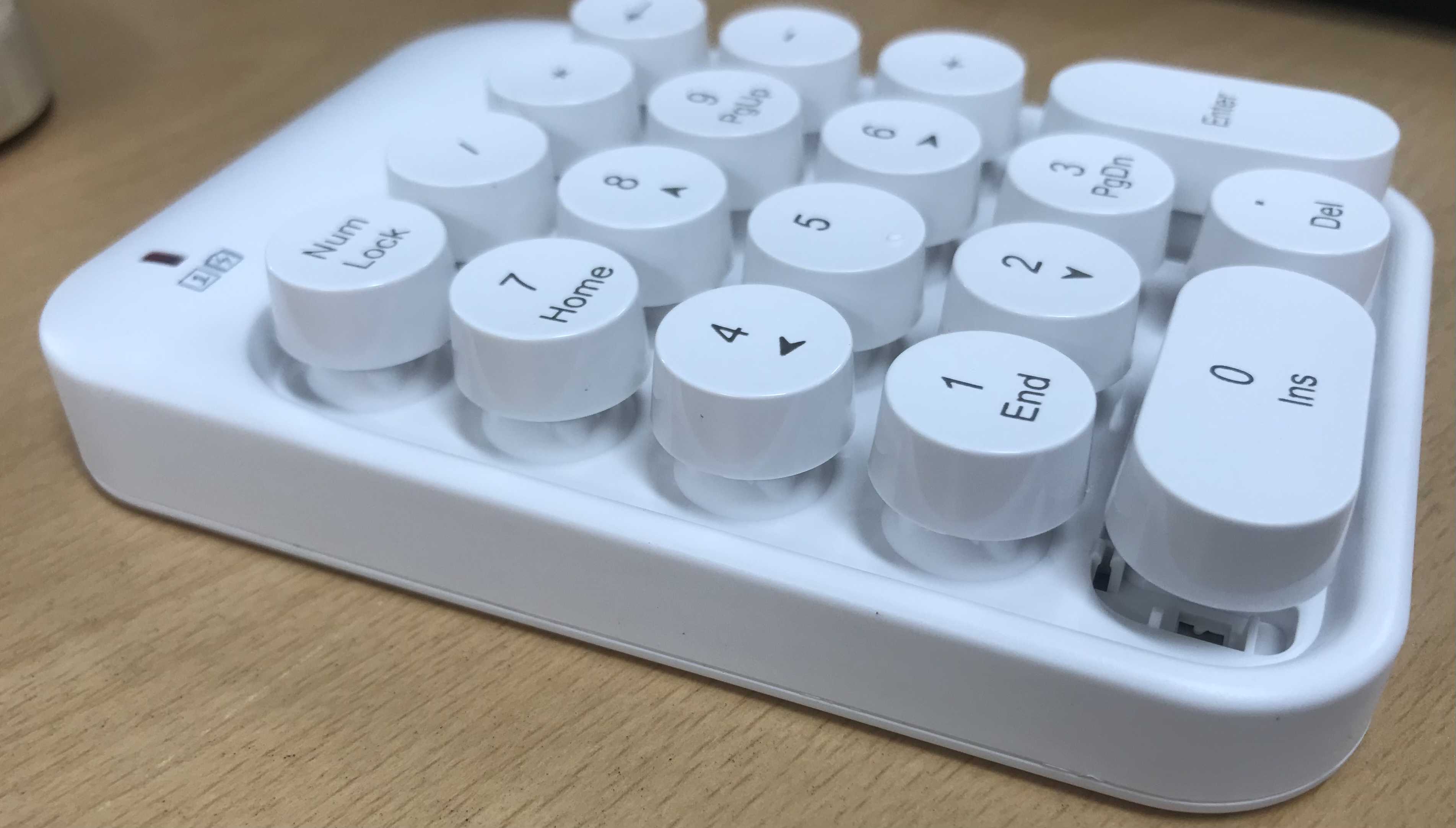 키는 보시다시피 옛날에 사용하는 타자기와 같은 동그란 모양입니다. 디자인에서 한번 먹어주고 있습니다. 키 방식은 멤브레인 방식으로 보급형 키보드를 사용하는 느낌과 같습니다. 다만 키캡이 좀 높은 감이 있습니다. 기존의 텐키와 다른 배열을 보이고 있습니다. 좌측 상단에는 입력된 숫자를 지울 수 있게하는 기능도 있습니다.