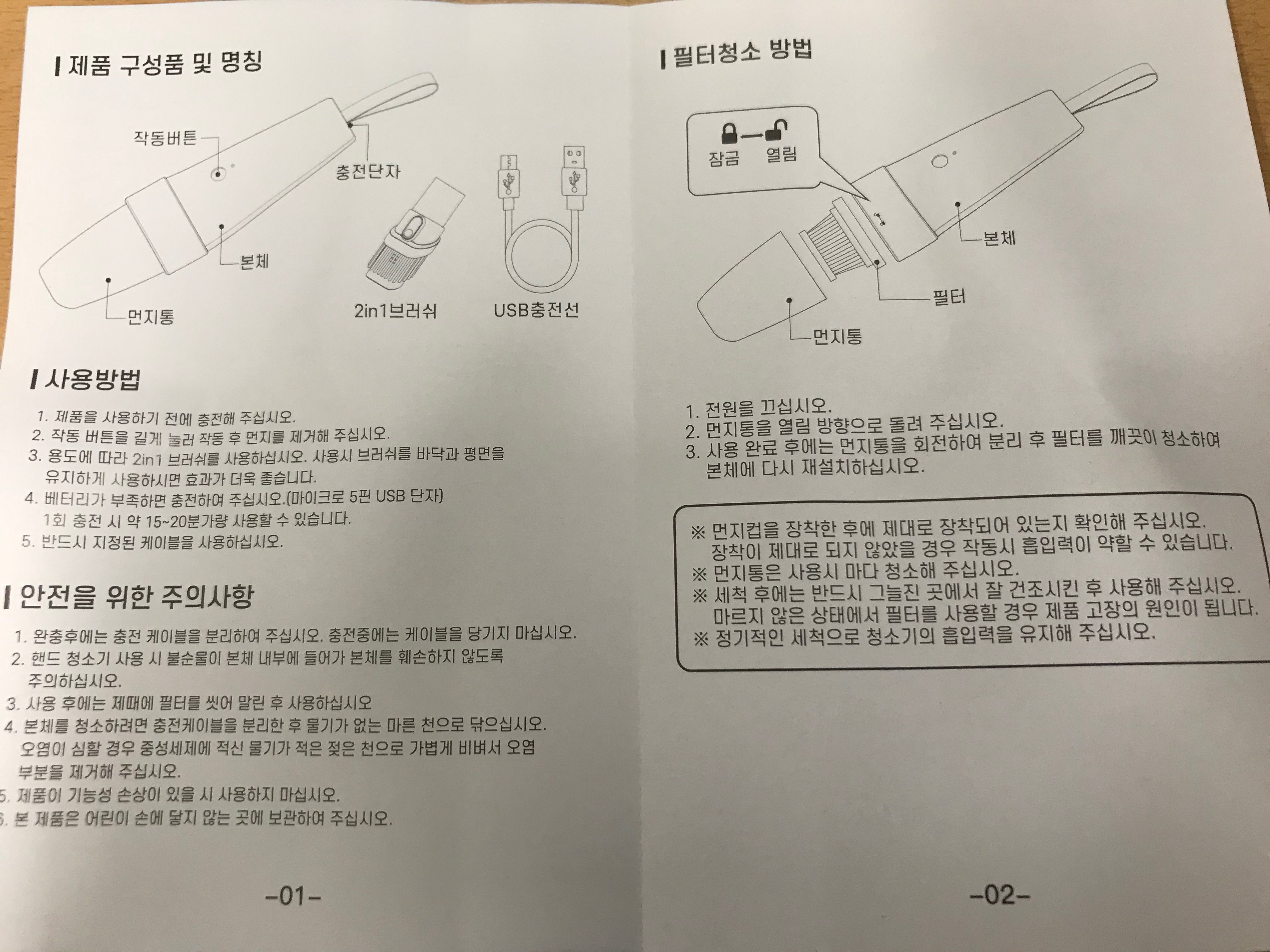 혹시 모르니 설명서도 첨부해 놓습니다. 간단합니다. 구성도 간단하고 설명도 쉽습니다. 청소기에도 전원버튼 하나만 있기에 남녀노소 누구나 사용 가능합니다. 한번 완충하면 15~20분 정도 사용이 가능하다고 하니 꽤 긴시간을 사용할 수 있습니다.