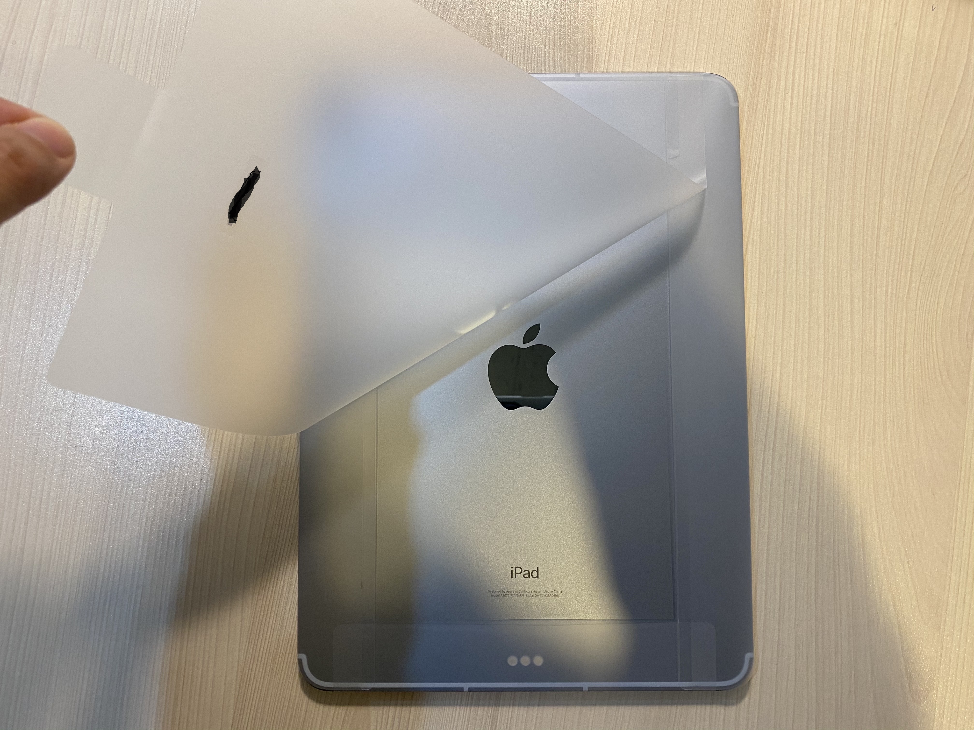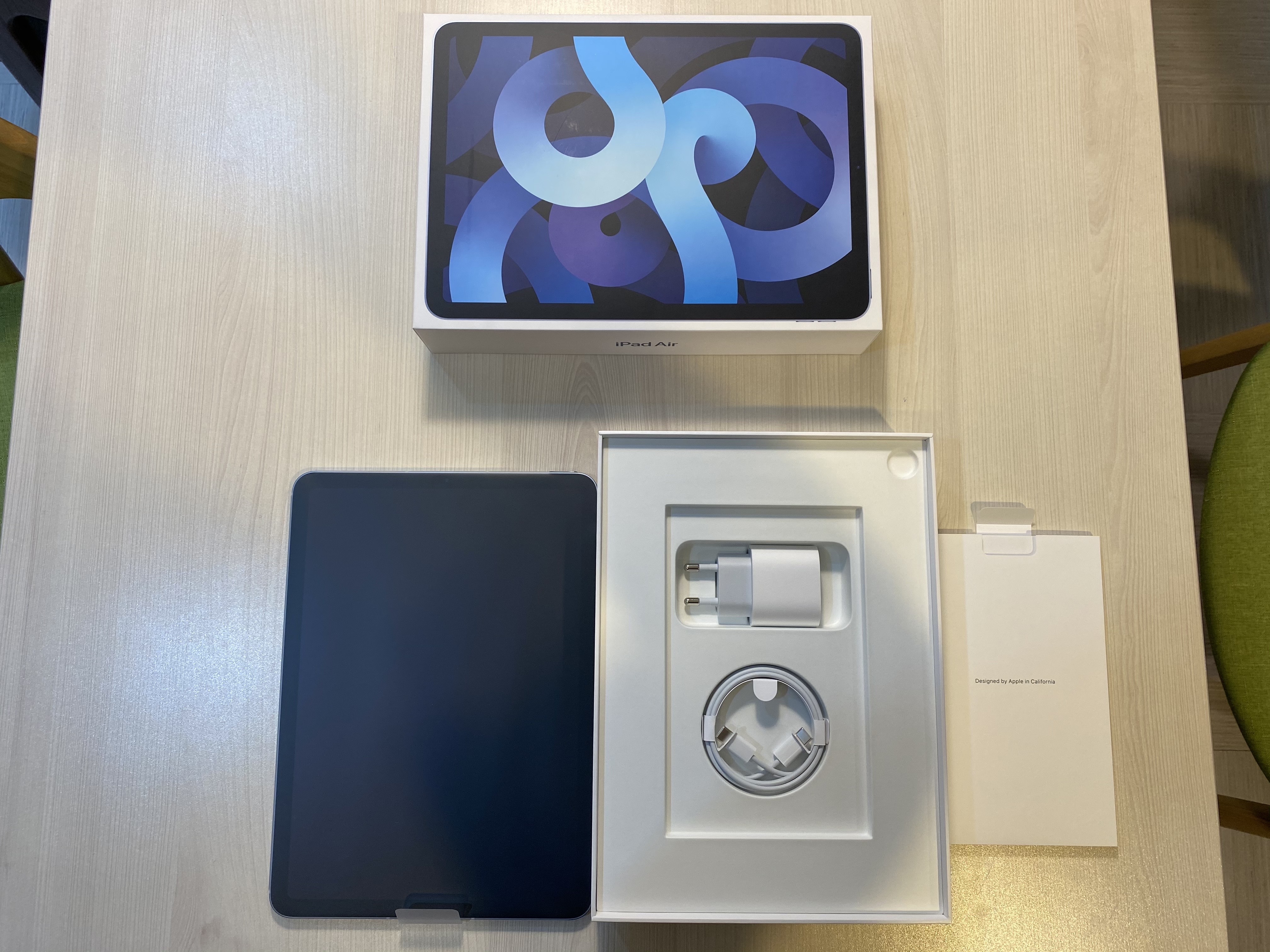 새로사면 이 순간이 가장 좋을 때죠. 밀착되어 있는 필름을 벗겨보면 그 속에 기스하나 가지 않은 새 상품이 모습을 드러냅니다. 포장도 크게 하나 되어있고 네 귀퉁이에 작게 되어있습니다. 살살 다 뜯어줍니다. 스카이블루임에도 쨍하지 않고 어느 정도 특색이 있기 때문에 질리지도 않을 것 같습니다. 베젤 주변으로는 안테나간 간섭을 막는 절열띠가 있고 하단에 스마트 키보드와 연결할 수 있는 스마트 커넥터도 있습니다. 이 때문에 전작에서는 프로만 지원하던 다양한 주변기기를 아이패드 에어에서도 활용할 수 있습니다.