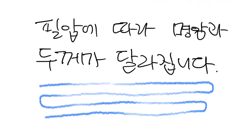 위에 파란선은 제가 세기를 조절하며 선을 그었는데 두께나 명암이 달라지는 것을 볼 수 있습니다. 필압 구분으로 보다 세밀한 표현이 가능합니다. 있으니 좋은데, 이제부터 이걸로 뭘해야하난 차근차근 생각해 봐야할 것 같습니다. 사실 저는 펜슬보다 키보드가 더 필요하다고 생각을 하나, 패드가 있으면 펜슬은 당연히 있어야겠다는 생각으로 구매를 했습니다. 직장인들이 PDF로 보고서를 검토할 때나 학생들이 공부할때 꽤나 유용하게 쓰일 것으로 보입니다.