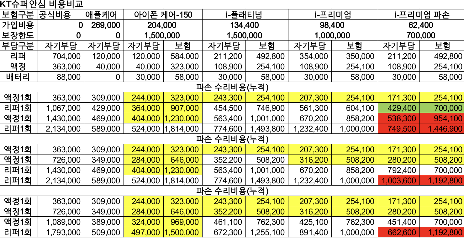 세가지 경우에 나눠 시뮬레이션을 해보았습니다. 첫번째 경우는 액정이 한번 고장나고 그다음에 리퍼를 한번 받고 그다음에 다시 액정을 한번 갈고 리퍼를 하는 경우입니다. 두번째는 액정을 두번 갈고나서 리퍼를 두번하는 경우입니다. 마지막 세번째는 액정을 세번 갈고 리퍼를 한번 하는 경우입니다. 애플케어+가 우발적 사고 4번만 보상을 하기 때문에 저도 4번 발생한다는 가정으로 비교하였습니다. 결과는 위의 표와 같습니다. 빨간색은 보장 불가영역이며 녹색은 근소한 차이로 슈퍼안심이 비싼 경우입니다. 노란색은 슈퍼안심이 애플케어보다 싼 경우입니다. 보시면 한번의 받을 경우는 모든 경우에 슈퍼안심이 싼 것을 볼 수 있습니다. 특히 아이폰 케어는 리퍼 두번 전까지는 가격이 저렴합니다.