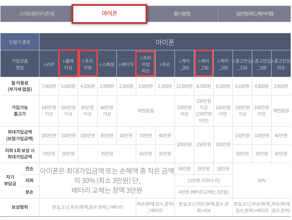 KT의 슈퍼안심 아이폰은 위와 같습니다. 자세히 설명되어 있지만 직관적이지 않아 상품을 잘 이해하기가 힘듭니다. 저는 아이폰 12 PRO를 쓰기 때문에 리퍼를 한번이라도 할 때 의미가 있는 상품인 i-플래티넘, i-프리미엄, i-프리미엄 파손, i-케어_150 상품을 위주로 비교해 보겠습니다. 나머지 상품은 리퍼 최대가입금액이 낮아 리퍼를 한번 이상 애플케어보다도 보장이 떨어지기에 제외하였습니다. 하지만 휴대폰을 쓰면서 리퍼는 한번만 받으면 족하다 또는 액정 한번 두번 정도 갈 정도면 충분하다 싶으면 i-스페셜, 혹은 베이직 정도면 충분합니다. 최소한의 보장만 원한다면 i-파손도 나쁘지는 않습니다. 다만 두번 이상의 확실한 보장을 원한다면 적어도 최대 가입금액이 100만원은 되어야합니다.
