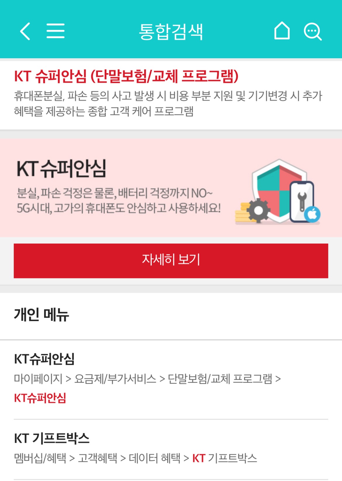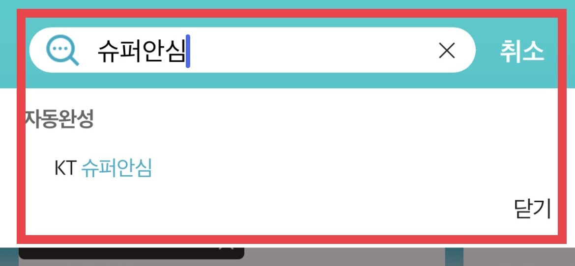 저는 어플로 가입을 했습니다. 일단 KT 어플을 받아 실행합니다. KT 이용자에게 KT 어플은 상당히 유용하기 때문에 웬만하면 받아두는게 좋습니다. 명세서나 사용량 확인, 혜택확인하기에 좋기 때문입니다. 실행하고 검색창에 “KT 슈퍼안심”을 검색합니다.