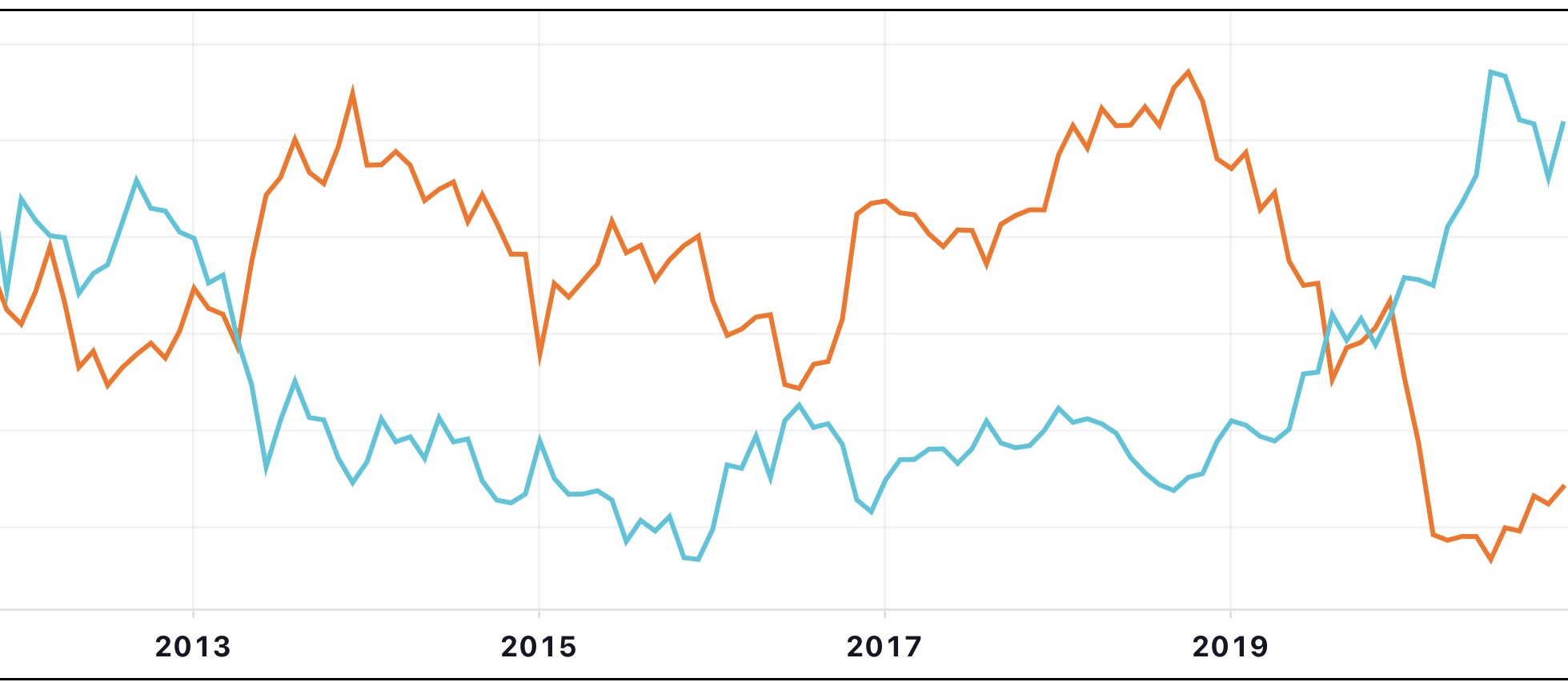달러의 가치가 빠지면서 코스피가 뜨는 것을 볼 수 있습니다. 이처럼 음의 상관관계를 가지는 자산을 찾는 이유는 간단합니다. 한가지가 예측하기 어려울 때, 그와 대비되는 다른 자산을 보면서 향후 방향성을 알기에 용이합니다. 원달러 환율이 이렇게 까지 빠지는 상황에서 앞으로 더 빠질 수 있을 것이라고 장담할 수 있을까요? 코스피가 더 뜰 수는 있습니다. 하지만 환율이 더 빠질 것이라고는 생각하기 힘들죠.