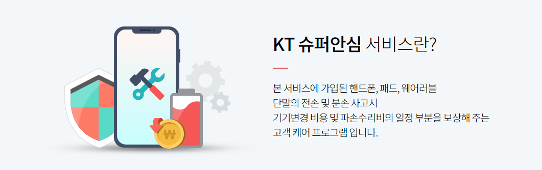 휴대폰의 기술이 발전함에 따라 가격이 점점비싸지고 있습니다. 예전에는 카메라가 전면, 후면만 있었다면 이제는 전면 카메라는 물론, 후면 카메라는 두개 세개가 기본입니다. 그만큼 비싸진 휴대폰을 위해 보험을 따로 들고 있는 것을 보고 있자니 뭔가 이상한 느낌이 듭니다. 하지만 준비해서 나쁠 것은 없겠죠. 이번에는 이전에 썼던 글에 이어 KT 슈퍼안심에 가입하는 방법에 대한 포스트를 쓰려고 합니다. 누가보면 KT 직원이라도 되는 줄 알겠지만, 저는 그냥 알아낸 정보를 인터넷에 올리고 싶어하는 단순한 블로거입니다.
