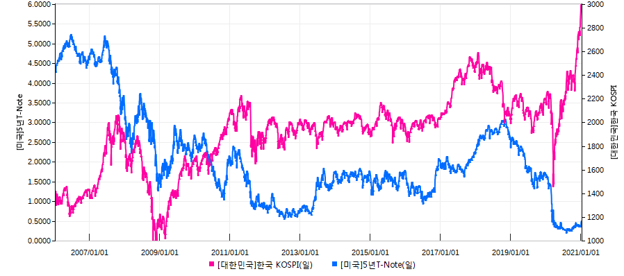 다음으로 보실 것은 미국 국채금리입니다. 통상 장기금리는 10년물로 보고 단기에서 벗어나는 중장기 지표금리로 5년물을 많이 이용합니다. 단기 금리는 기준금리에서 자유로울 수가 없는데 장기물은 기준금리와 다르게 시장금리를 반영하기 때문입니다. 위의 그래프를 보시면 역시 코스피와 역의 상관관계를 가지고 있습니다. 미 연준에서도 일부 의사결정권을 가진 인사들이 미국 경기가 생각보다 빠르게 회복될 수 있다고 언급하고 있고, 시장에서는 장기채권을 매입하는 양을 줄이는 테이퍼링이 생각보다 빠르게 실행되지 않겠냐는 이야기가 나오고 았습니다. 테이퍼링를 실행하면 연방준비제도가 국채 매입을 줄여나가기 때문에 국채 금리가 상승(수요감소)합니다. 또한, 미국의 민주당이 상원과 하원을 모두 차지하는 블루웨이브가 현실화되었고 재정지출을 늘리는 경기 부양책을 지속할 것으로 보입니다. 경기부양책을 하기위해 국채발행을 늘리면(공급증가) 국채 금리는 또 올라갑니다. 어쨌든 금리는 오릅니다.