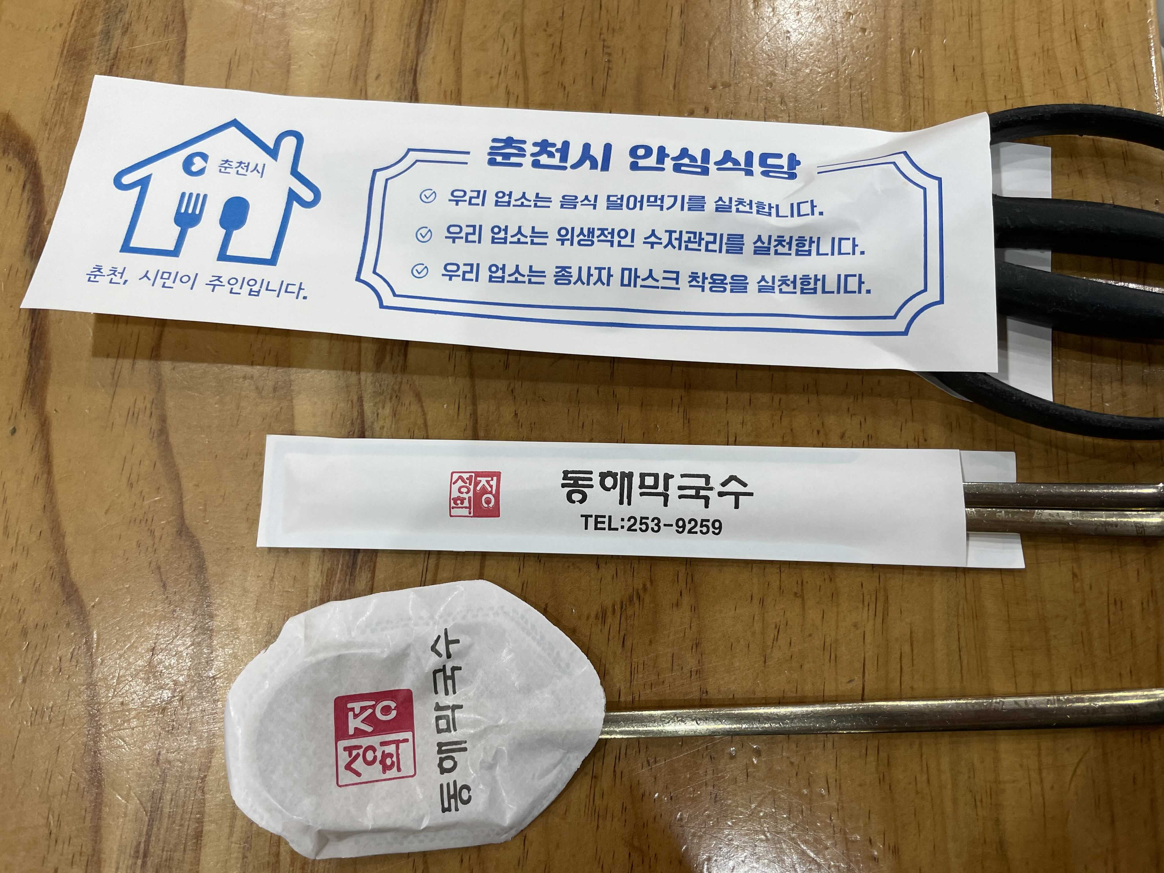 무엇보다 인상깊었던 것은 수저세트입니다. 정갈하게 종이에 쌓여있었습니다. 보통은 수저를 수저통에 넣어 놓는데 많은 사람들이 사용하다보면 자칫 위생적이지 않을 수가 있습니다. 동해 막국수에서는 위생적으로 개별 포장을 해서 넣어 놓았습니다. 정말 철저한게 가위 조차도 개별 종이포장을 해서 줍니다.