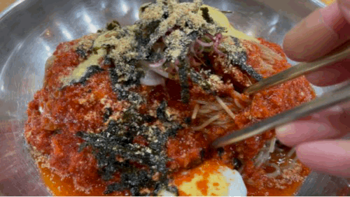 저는 어디를 가나 면은 곱배기를 시켜서 먹기 때문에 비빔 막국수도 곱배기를 시켰습니다 계란 반쪽과 새싹 그리고 양념장이 넉넉하게 올라간 비빔 막국수 입니다. 양념은 새콤 매콤하면서 생강 맛도 나는게 정성들여 만든 맛이 납니다.