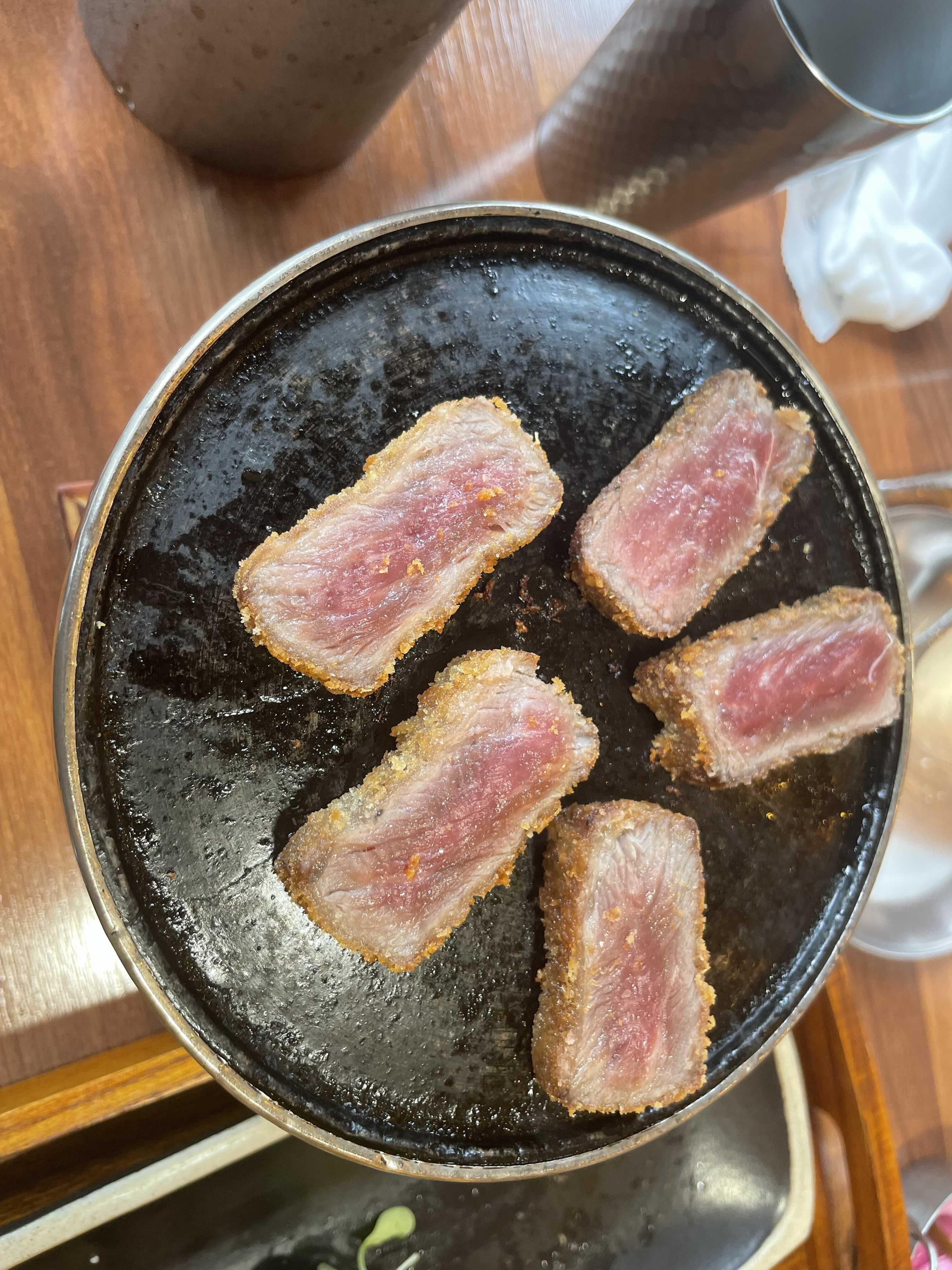 같이 나오는 구이용 판에 구워먹으면됩니다. 돈까스를 또 구워먹다니 참 참신한 발상이죠? 번거롭게 먹어야 맛있게 먹는 맛이납니다. 뭔가 디테일이 숨어있는 듯한데 그냥 고체연료를 태운 감성구이판입니다. 요새 캠핑을 다니는데 감성은 다 필요없습니다. 오로지 실용이 중요한데 여기서는 직원들이 다 준비해주니 실용따위 필요없습니다. 고체연료는 2개를 더 피웠습니다. 생각보다 불이 빨리 꺼지더라고요.
