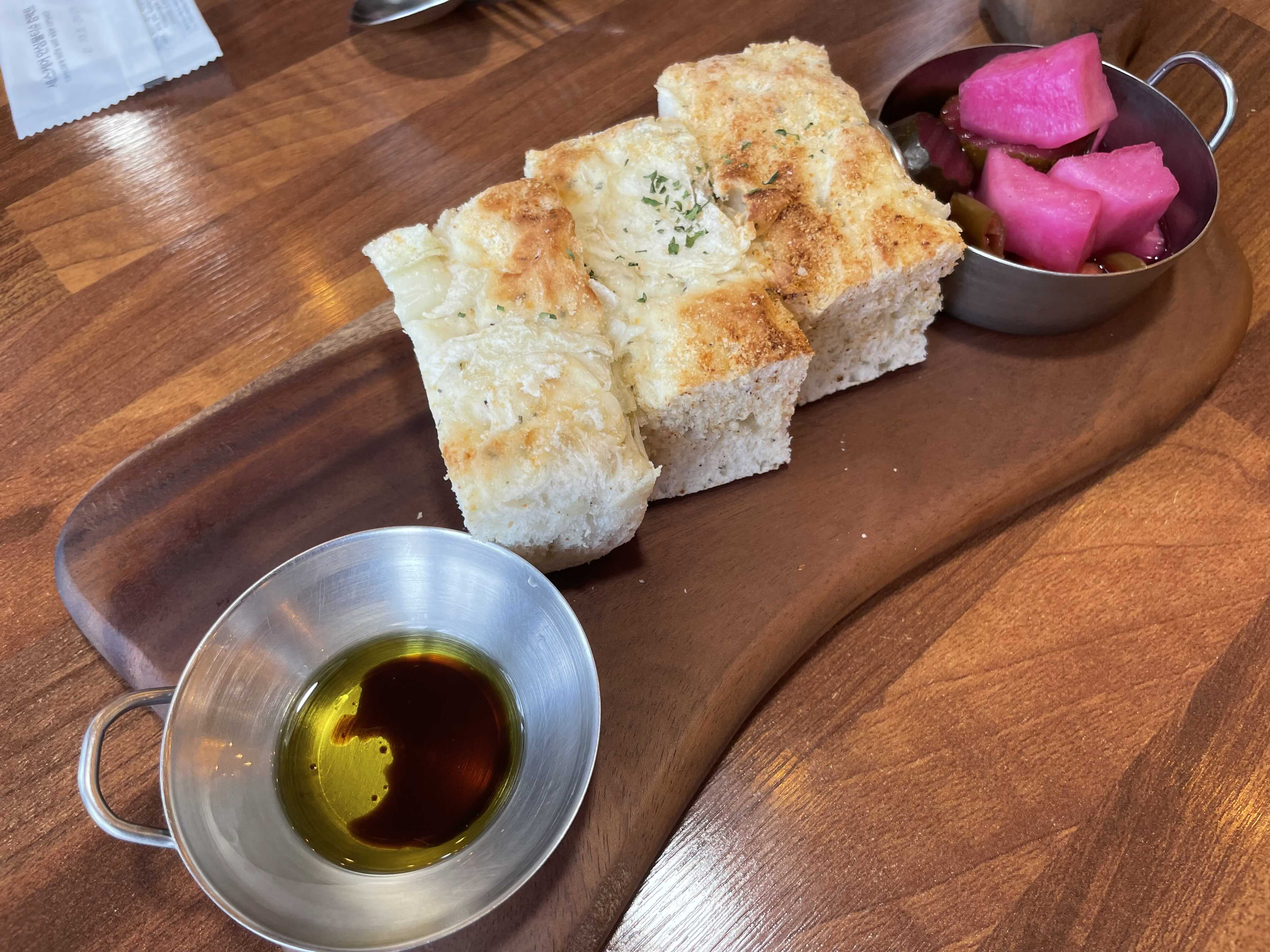 식전빵이 간단하게 나왔씁니다. 저희는 규카츠 두개와 빠네, 그리고 마르게리따 피자를 시켰습니다. 규카츠가 메인이라고 하길래 두개를 시켰죠. 식전빵은 따끈하고 달달하니 맛있게 나왔습니다. 같이 나온 무와 피클, 그리고 소스에 찍어 먹으니 허기진 배를 달랠 수 있었습니다.