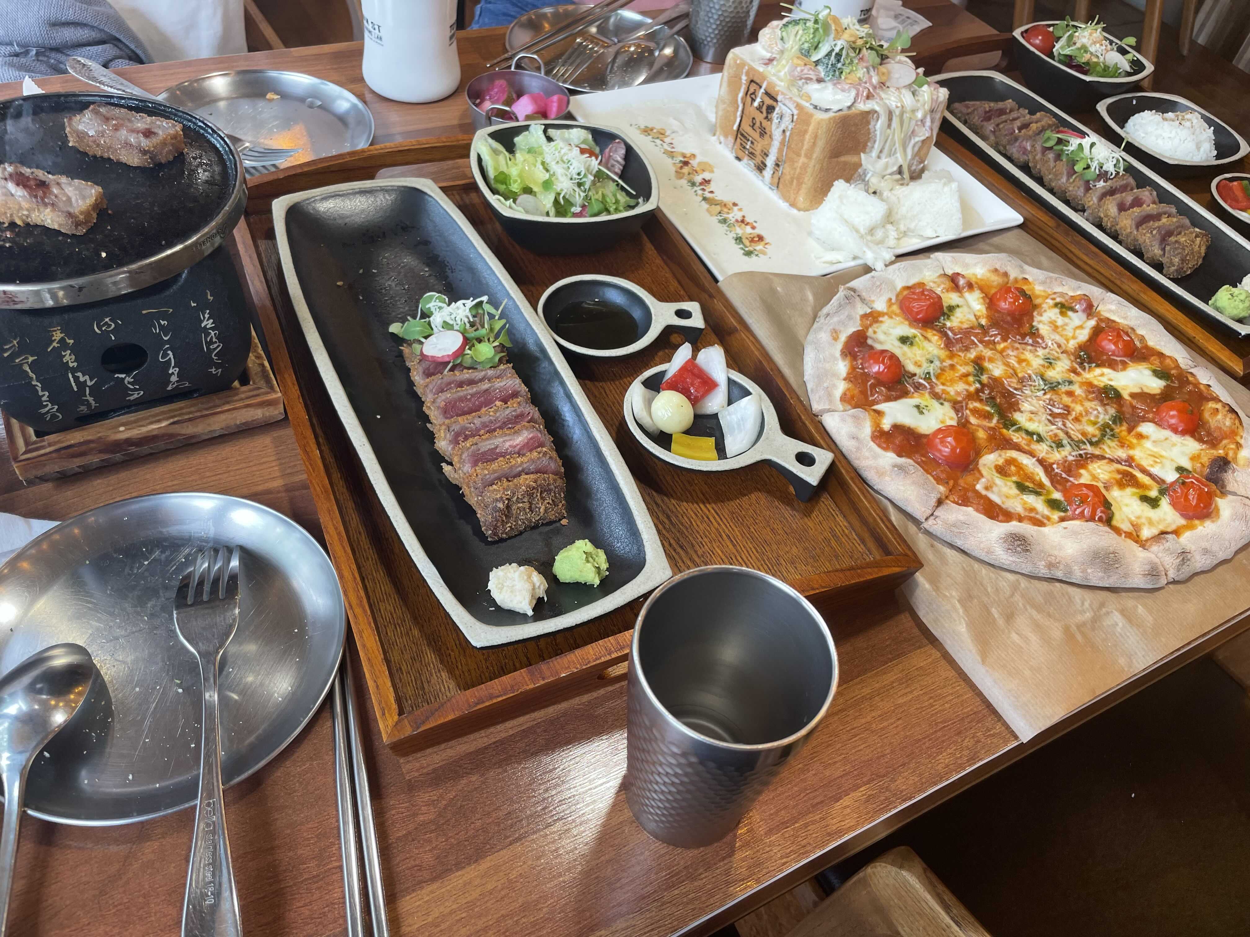 전체적으로 뭘 먹었는지 보려고 테이블 전체샷을 찍어보았는데요. 규카츠가 두접시있고 빠네, 그리고 마르게리따 피자가 있습니다. 총평을 하자면 춘천 거두리 어반스트리트 컨템포러리는 조용한 곳에서 여유롭게 식사하기에 좋은 곳입니다.
