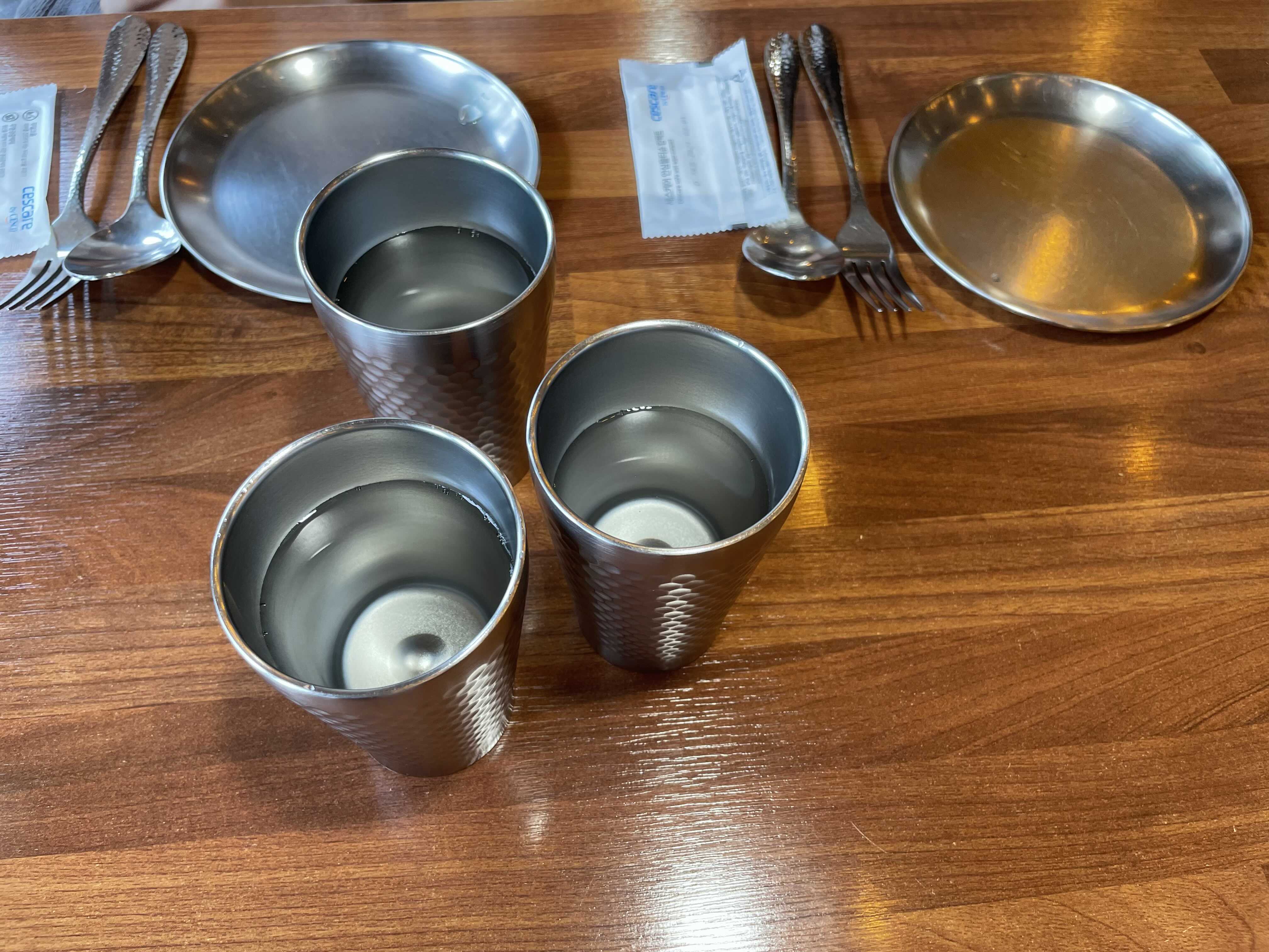 컵부터 접시, 수저, 포크 그리고 주전자까지 식기는 전부 스테인레스 재질입니다. 스테인레스가 깔끔하고 변형이나 변색이 없어서 좋더라고요. 우드테이블에 스테인레스 맞춤은 항상 잘어울립니다. 내부에 신경을 쓴 느낌입니다.
