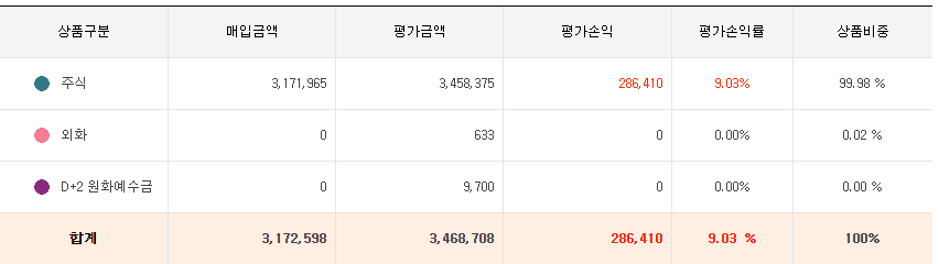 아무도 궁금해하지 않을 계좌를 한번 까보겠습니다. 포트폴리오를 보시면 아시겠지만 주식에 몰빵되어 있기 때문에 수익률이 크게 나쁘지는 않습니다. 특히, 저는 증권사를 두개 이용하고 있습니다. 국내주식은 미래에셋에서 주로 거래를 하고 있으며 9.3% 이익이 나고 있고, 해외주식의 경우는 키움증권을 사용하고 있으며 20%의 수익이 나고 있습니다.
