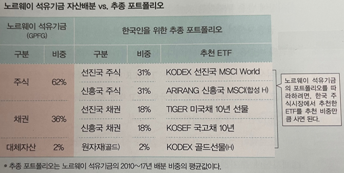 얼마전에 읽은 디플레 전쟁에서 홍춘욱 이코노미스트가 두가지 포트폴리오를 제안했었습니다. 포스트에는 직접적인 내용을 담지 않았지만 홍춘욱 이코노미스트는 저서에 국내에 상장되어있는 ETF로 해외기관의 포트폴리오를 추종하는 방법을 제시하였습니다. 노르웨이 석유기금과 국민연금의 포트폴리오입니다. 다들 마이너스 상관계수를 가지는 채권과 주식을 동시에 투자하며 안정성과 수익성을 극대화 하는 모습을 볼 수 있습니다. 주식비중이 높은 노르웨이 석유기금형이 젊은 나이의 투자자가 가져가기 좋은 포트폴리오 구성입니다.