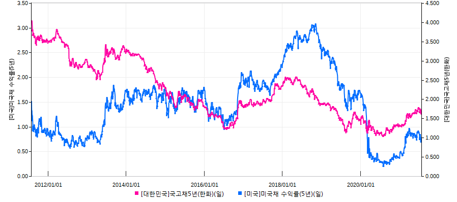 하지만 저의 투자스타일이 적립식 투자를 원칙으로 하고 있기 때문에 일정금액까지는 적립식으로 포트폴리오를 축적하고 자산이 꽤 모인 시점부터 포트폴리오 내에서 자산의 비중을 조절해나가는 방식을 취하고자 합니다. 또한 향후 금리 추이를 보았을 때, 채권에 대한 투자도 적극적인 매수 시점은 아니더라도 어느 정도 편입을 시켜나가야할 때라고 보고 있습니다. 채권금리가 꿈틀꿈틀 상승 압력을 받고 있는 것을 볼 수 있습니다.
