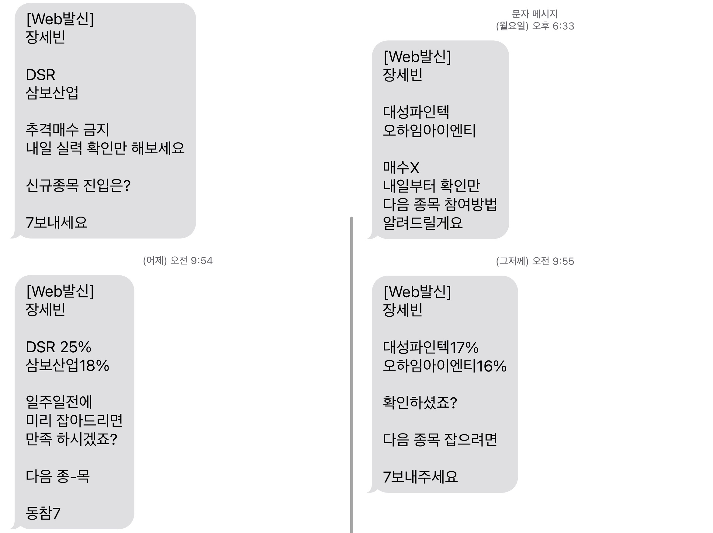 예전에는 문요셉이라는 분이 급등주 추천문자를 쏘더니 요새는 여러 사람들이 쏘고 있습니다. 이름을 보면 아주 예나, 장세빈 난리도 아닙니다. 그새 사기꾼들이 이런 패턴을 익혀서 재미를 보았는지 급등주 추천문자는 끊임이 없습니다. 별 관심도 없는 개잡주 종목을 알려주면서 돈을 벌라고 하니 이렇게 감사한 분들이 있을까 싶습니다. 하지만 전에도 말씀드렸 듯이 아무것도 아닌 정보를 가지고 주린이들을 홀리고 있습니다. 이런 무지성 정보가 판을 치니 리딩방 같은 옳지 않은 방법으로 투자하시는 분들이 늘어나고 주식으로 이익을 보기는 커녕 사기꾼에게 정보이용료만 날리고 손해만 보는 게 아닌가 싶습니다.