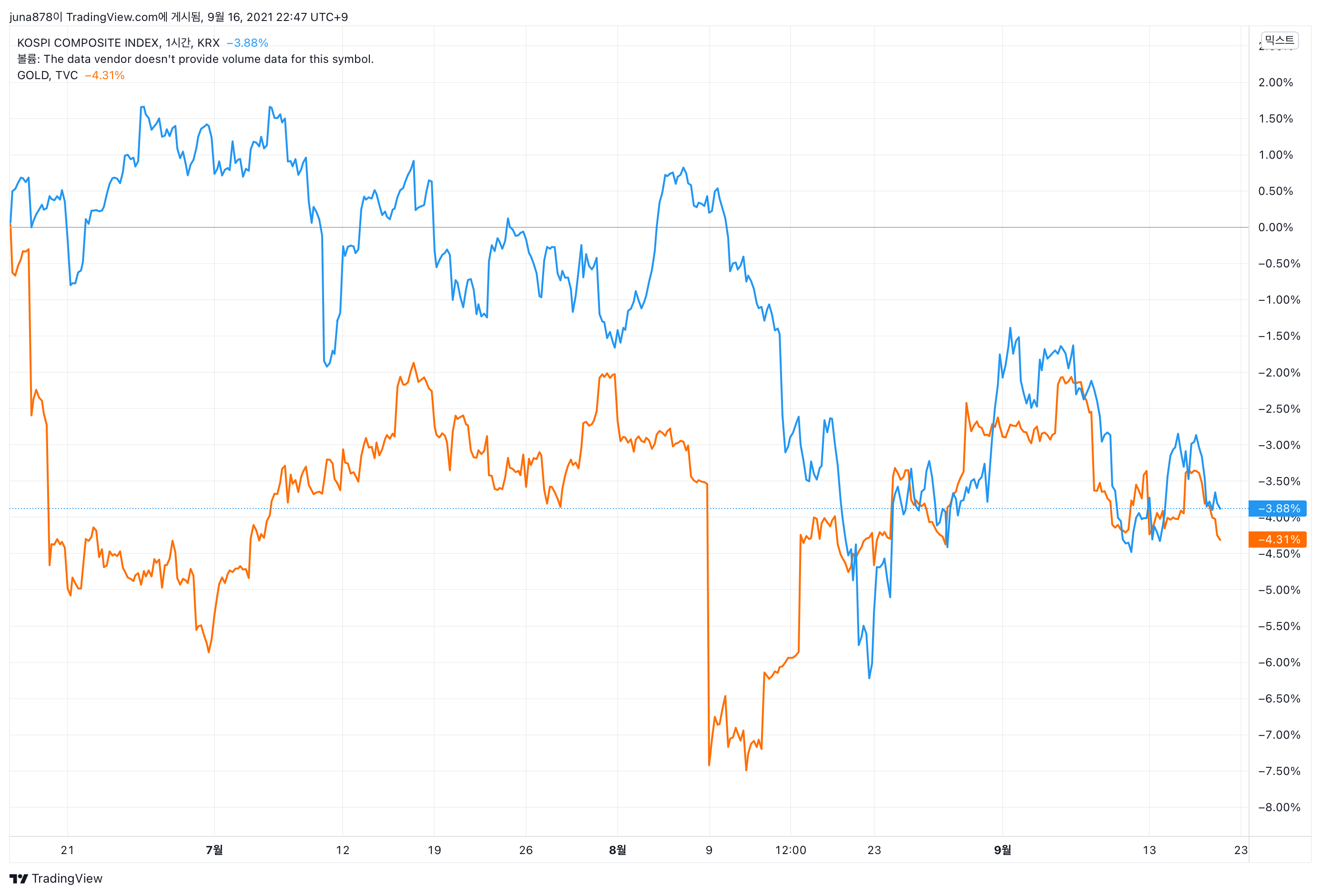이건 제가 정말 자주인용하고 좋아하는 그래프 중 하나입니다. 달러와 코스피의 상관관계를 보여주는데요. 예전에도 포스팅한 적이 있지만 언제봐도 완벽한 대칭관계를 보여줍니다. 저도 코스피가 너무 올랐다 싶으면 달러자산을 더 편입시키곤합니다. 하지만 요새 달러가 많이 뜬 감이 있죠. 양적완화를 축소하는 테이퍼링을 앞두고 있으니 달러의 가격은 앞으로 더 오를지도 모릅니다. 달러의 가치가 오른다는 것은 우리나라 같은 신흥국에게는 악재로 작용할 수밖에 없습니다. 그래서 주식투자를 하려면 꼭 달러자산과 분산투자를 해야합니다. 혹자는 안전자산인 금과 분산투자를 하면 안되냐고 물어볼 수도 있습니다.