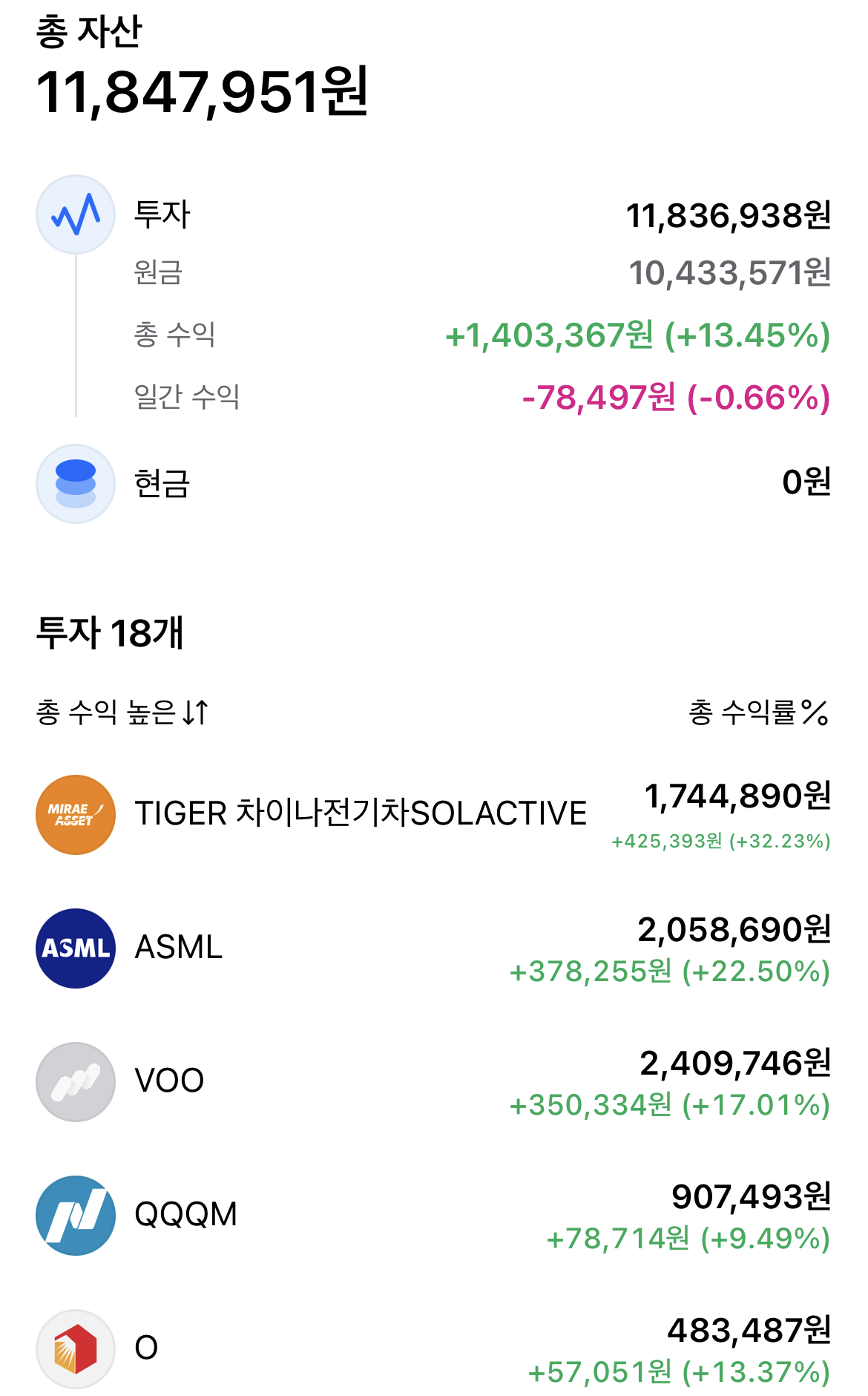 9월에도 8월에 이어 국내주식이 50만원, 미국주식에 40만원, 차이나전기차ETF 20만원, 달러ETF 20만원, 그리고 차이나베트남 펀드 20만원을 투자하여 총 150만원을 투자하였습니다. 투자하기 전에는 VOO 한종목과 리얼티인컴 주식을 팔아서 ASML 주식을 한주 늘리기도 했습니다. 자금의 투입은 한달에 한번 적립식으로 하지만 자금의 배분은 주기적이나 이슈가 있을때마다 하려고합니다.