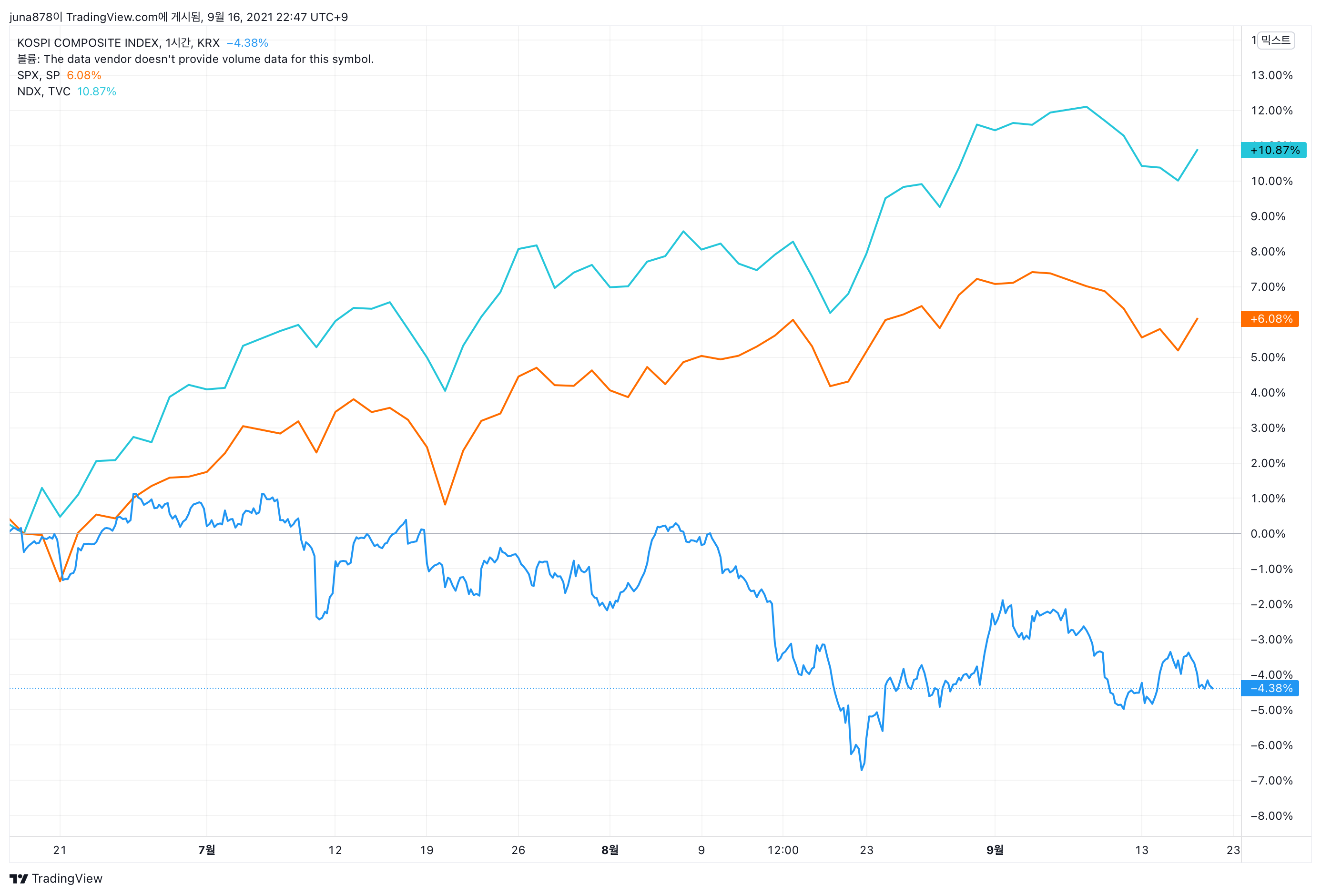 역사적으로 9월은 투자자의 수익이 가장 낮은 달이었습니다. 올해도 다르지 않습니다. 금융규제에서 시작된 카카오와 네이버의 낙폭은 계속 늘어나고 3천 3백포인트를 넘어섰던 코스피도 다시 3,100대로 주저앉았습니다. 국내주식에 중점적으로 투자한 사람들의 투자수익률은 좋지 않았을 것입니다.
