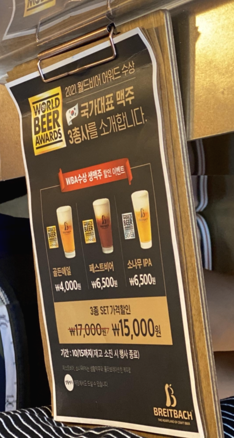 10월 15일까지 맥주대회에서 수상한 맥주들을 할인해서 판매하고 있습니다. 어쩐지 맥주를 3배수로 먹는 분들이 많다했습니다. 골든에일과 IPA 그리고 옥토페스토를 위한 페스트비어까지 3종을 할인해서 판매하고 있었습니다. 개인적으로 분위기도 맥주맛도 좋아서 재방문하고 싶은 생각이 든 훌륭한 도외지 느낌의 홍천, 횡성 근교 브루어리였습니다.