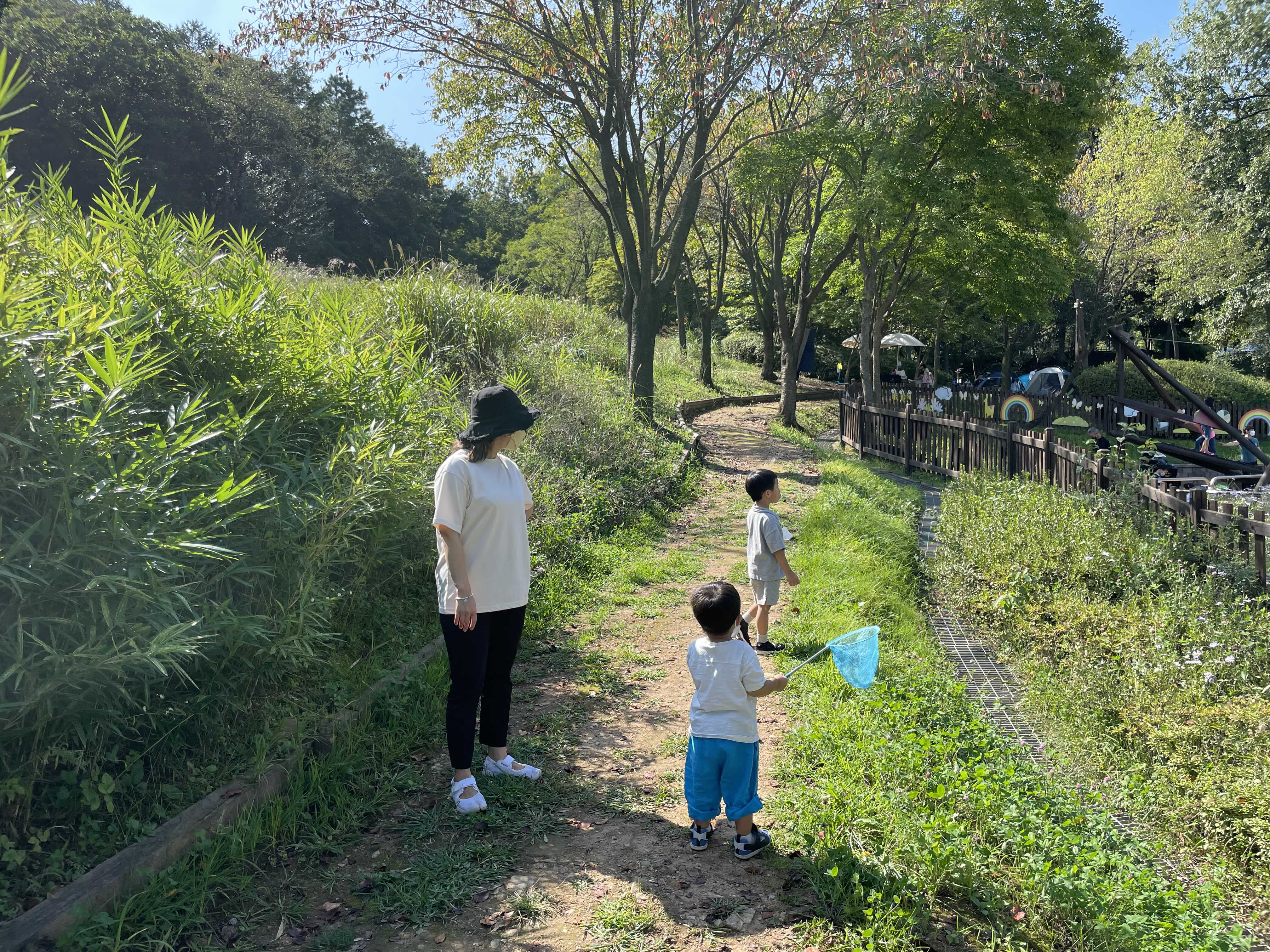 잔디밭 뒤쪽 산 아래에는 숲길이 있습니다. 잠자리가 많아서 잠자리도 잡았습니다.