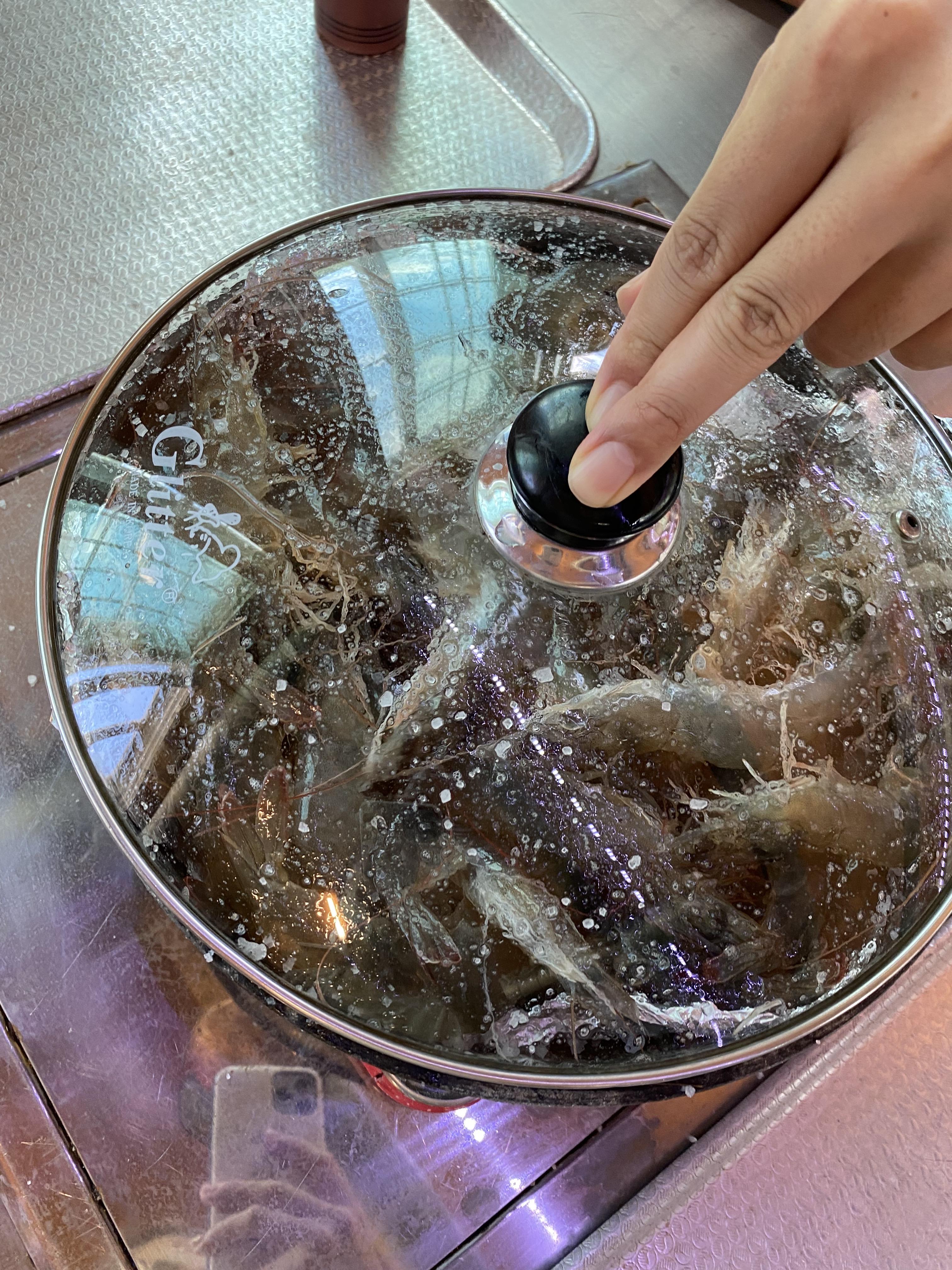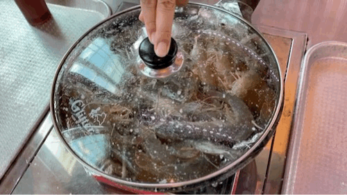 왕새우를 구워 먹으려면 소금구이가 일반적이죠. 생새우가 그냥 들어가기 때문에 이렇게 손잡이를 꼭 잡아줘야합니다. 안그러면 뚜껑을 열고 튀어나간다고 하네요.