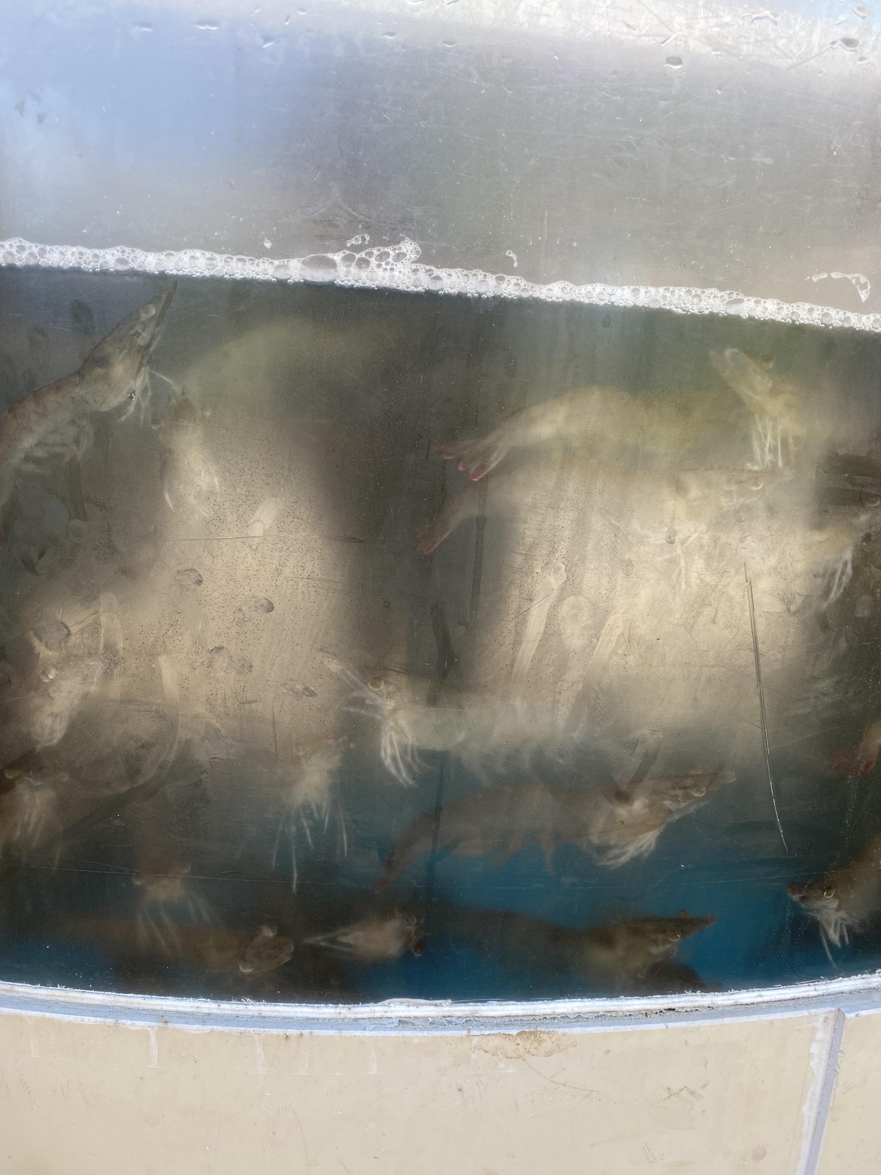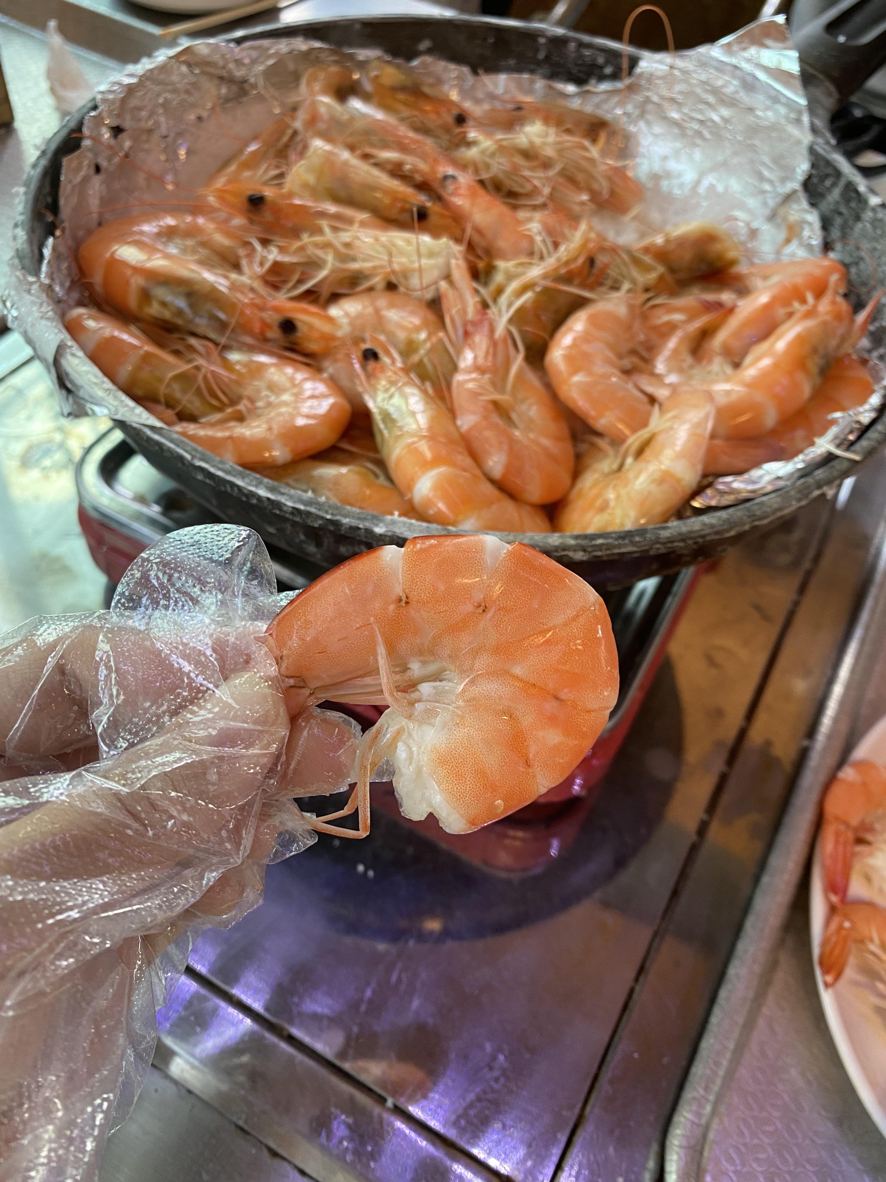 가게 옆에 있는 수족관에는 신선한 새우들이 자신의 운명을 모른 채 뛰어 놀고 있습니다. 곧 제 입으로 들어갈 새우들입니다.