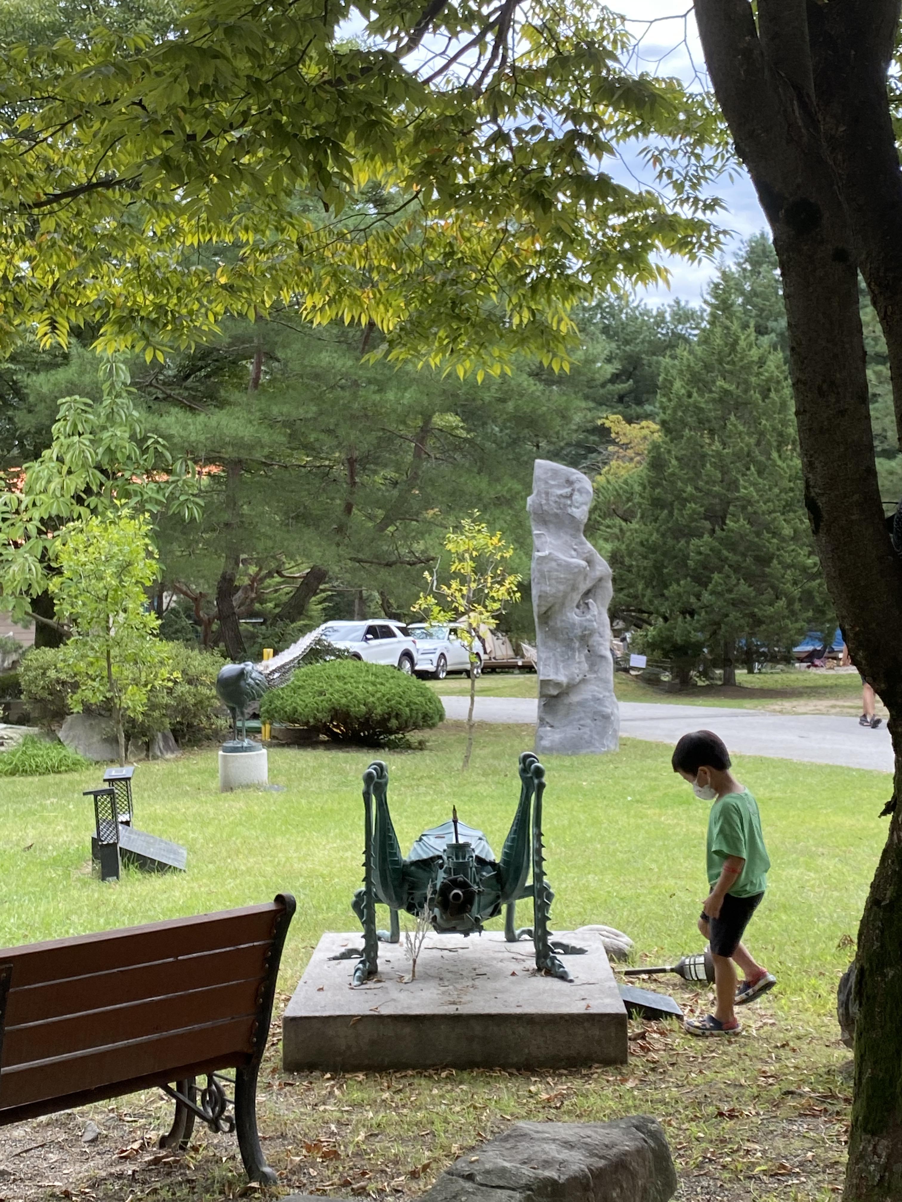 캠핑장을 들어가면 조각공원이 펼쳐져 있습니다. 이것저것 볼게 많죠. 한가지 단점이 있다면 입구가 좁아서 들어가는 차와 나가는 차가 한군데에서 정체 된다는 것입니다.