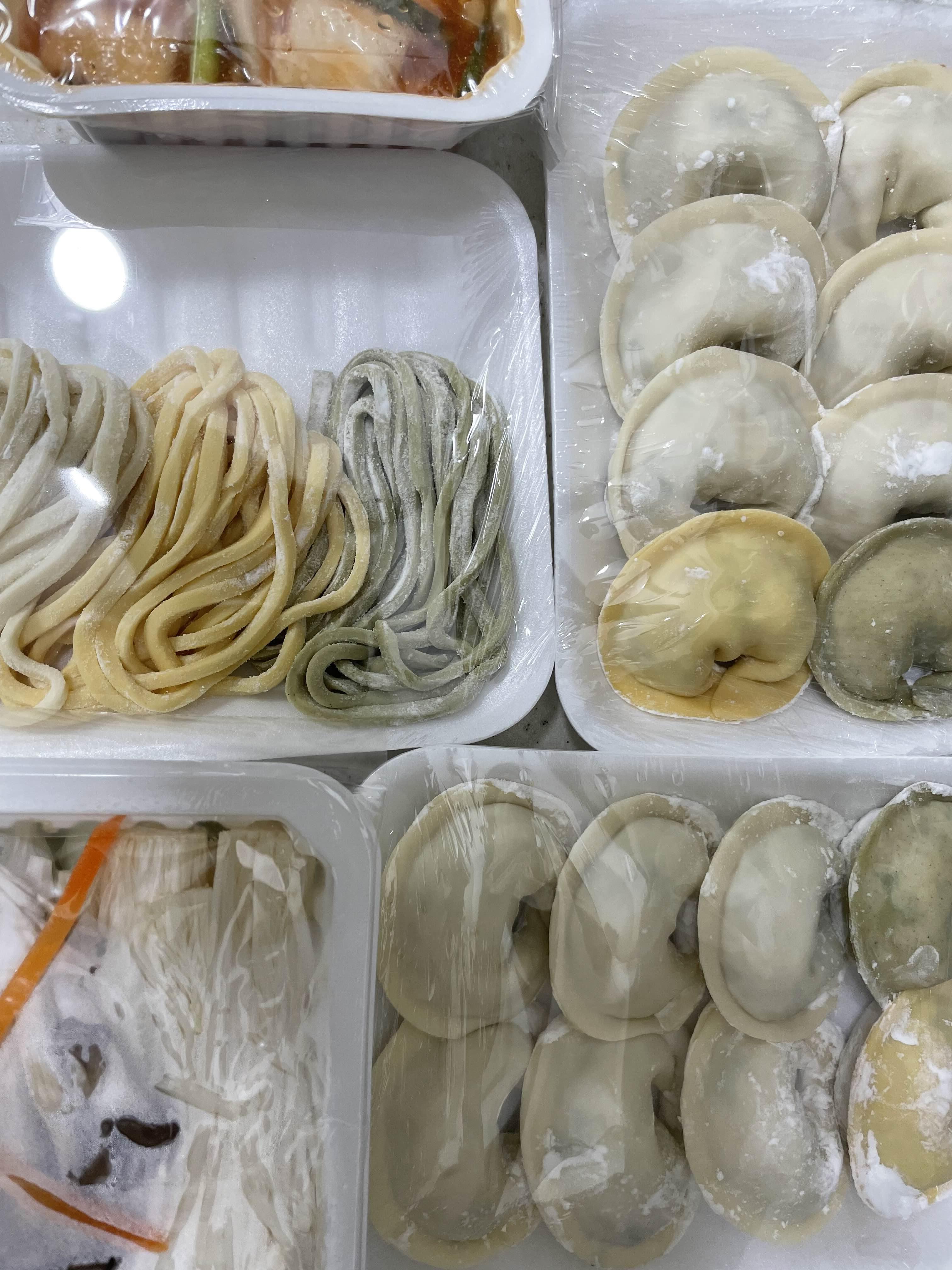 포장된 만두를 보면 특이한 색이 있는데요. 3색만두입니다. 만두피 반죽으로 칼국수도 하시는 듯했습니다. 칼국수도 쫄깃하고 맛이있는데 만두피도 역시 쫄깃합니다. 숟가락으로 잘 안 끊길정도입니다.