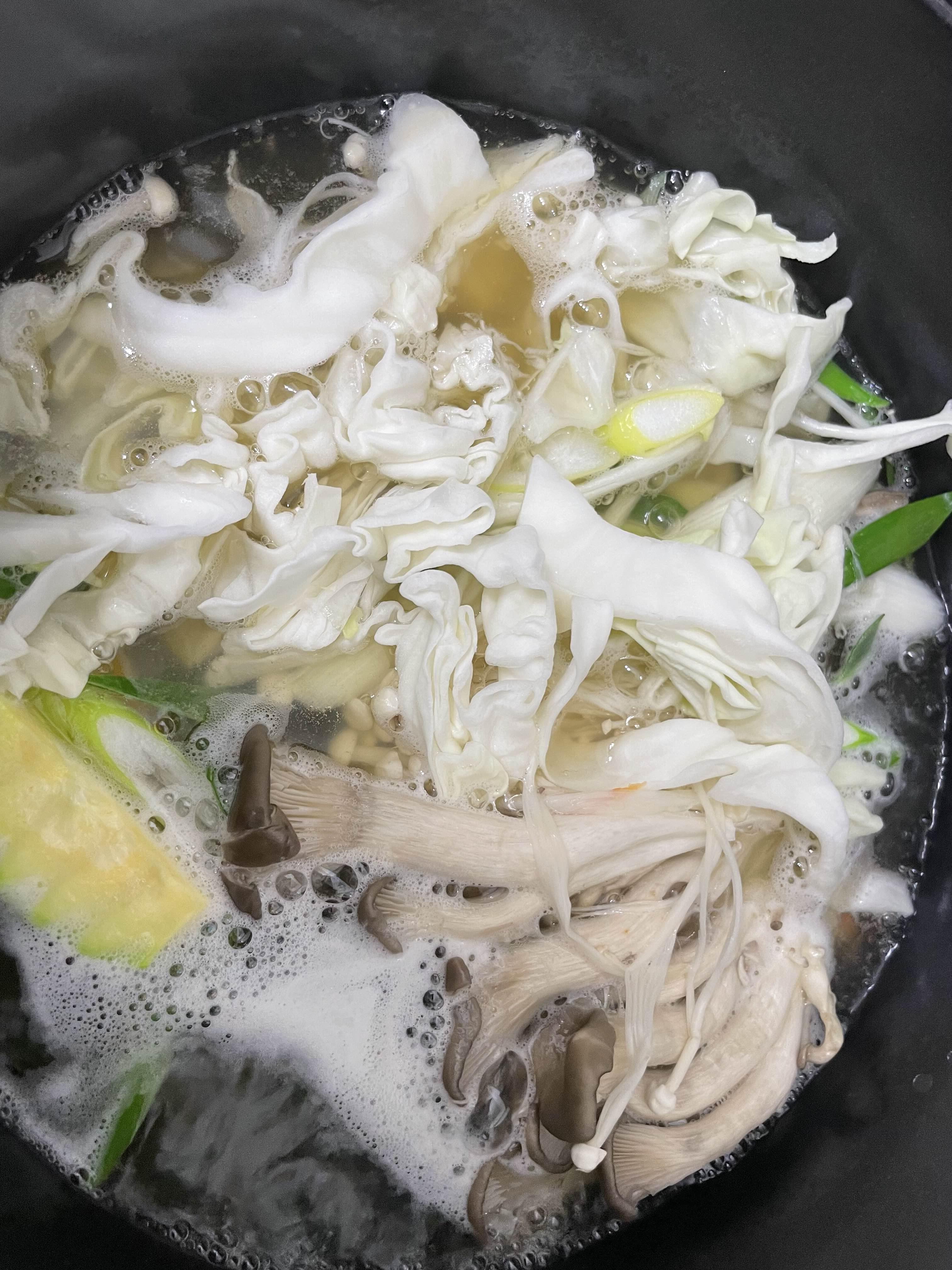 포장한 김치만두 전골 육수에 야채를 넣어줍니다. 조리법도 설명해주셨는데 육수를 먼저 끓인 후에 야채를 넣고 그 위에 칼국수를 넣습니다. 그리고 동시에 그 위에 만두를 넣고 6분간 끓인 후 먹으면 된다고 합니다.