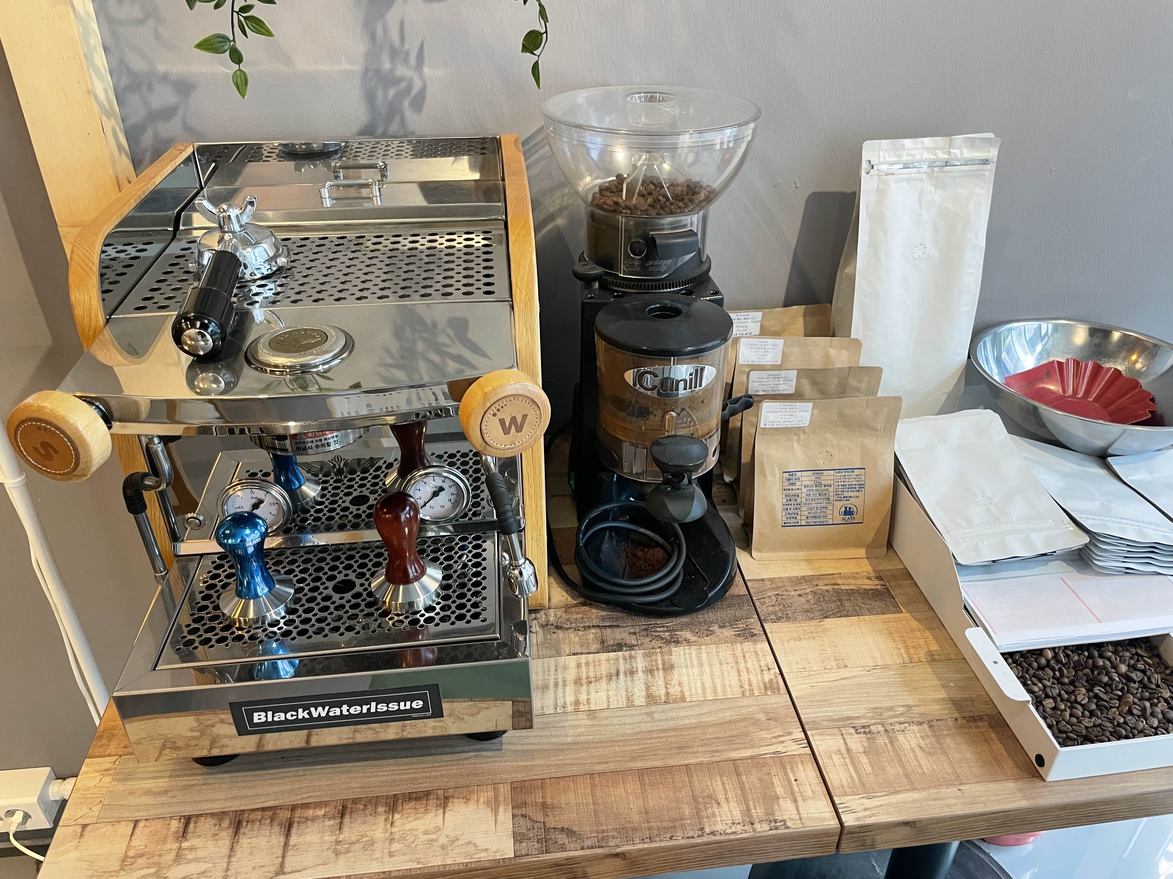 실내 장식으로 커피 소품을 많이 사용합니다. 에스프레소 머신과 커피전동 그라인더는 지금도 쓸 수 있을 것 같은데 옆에 데코로 해두셨네요.