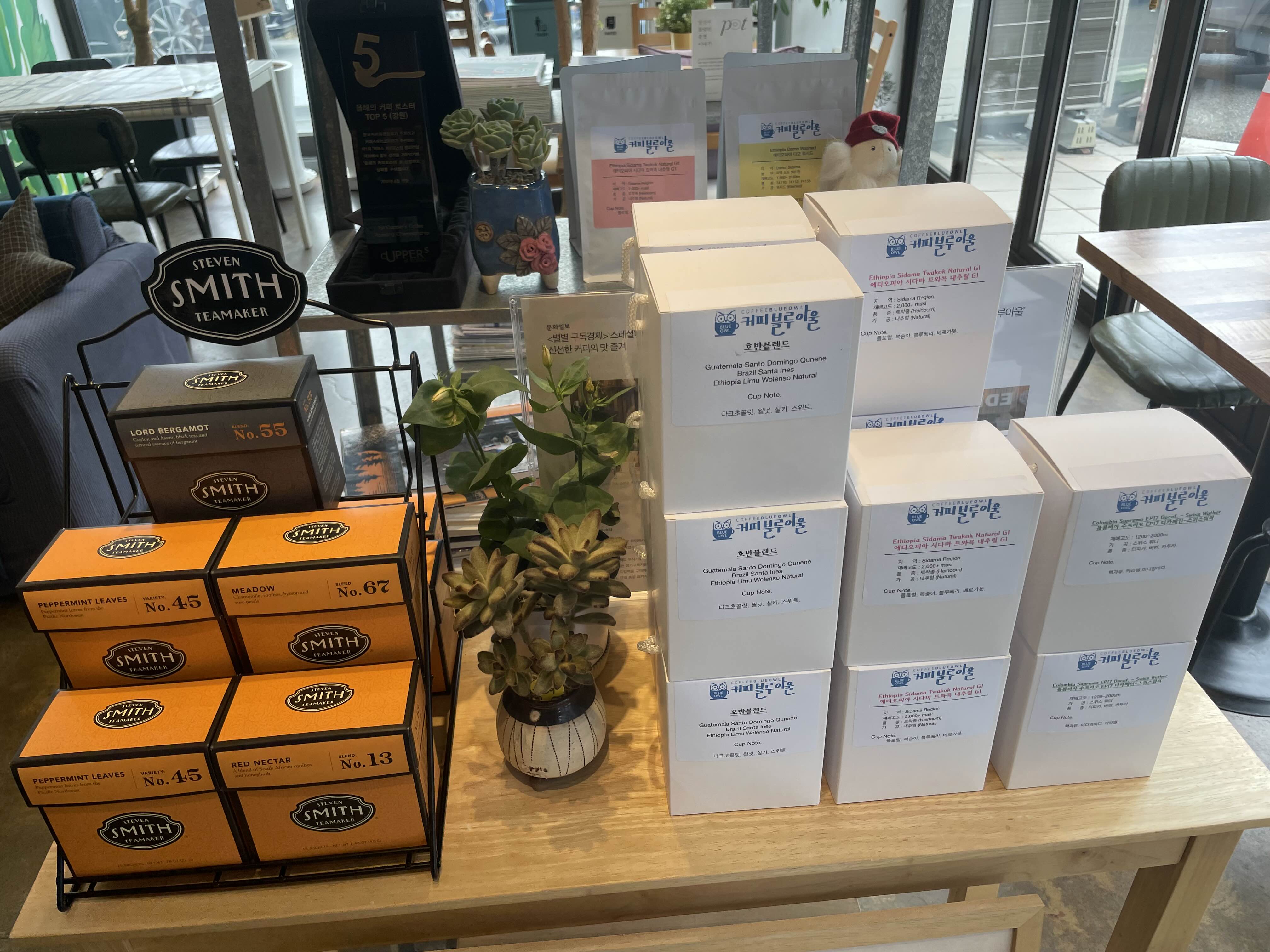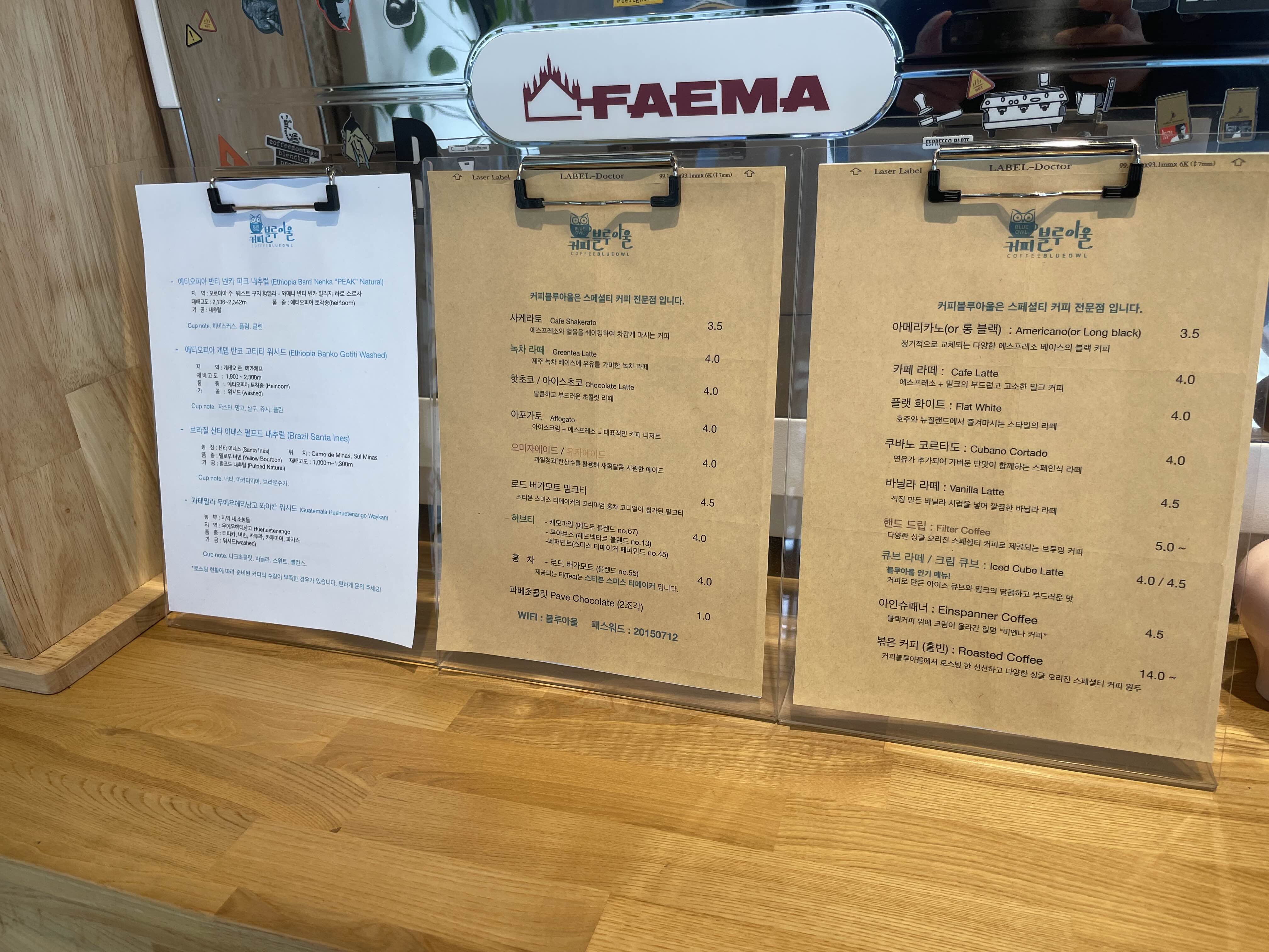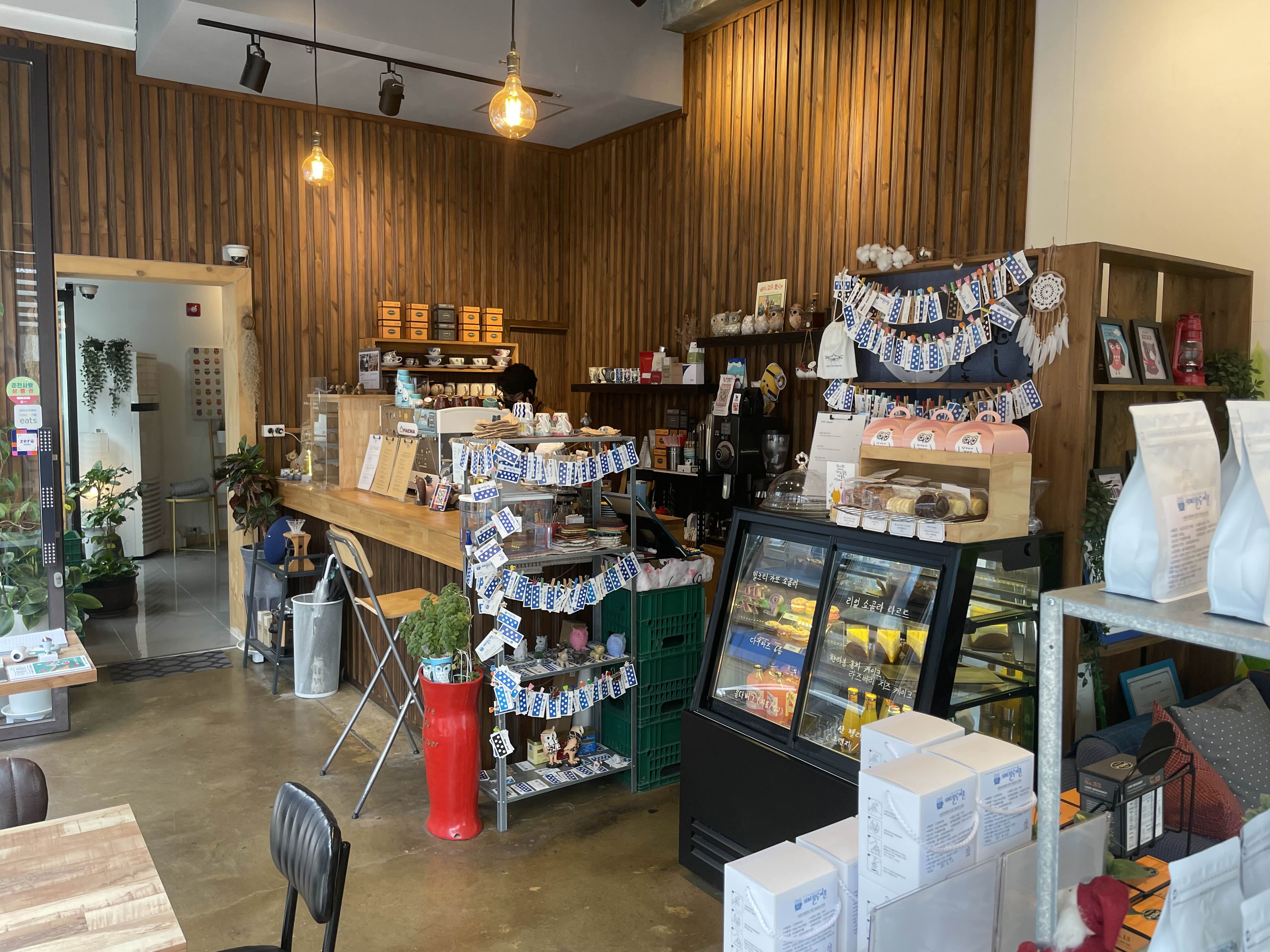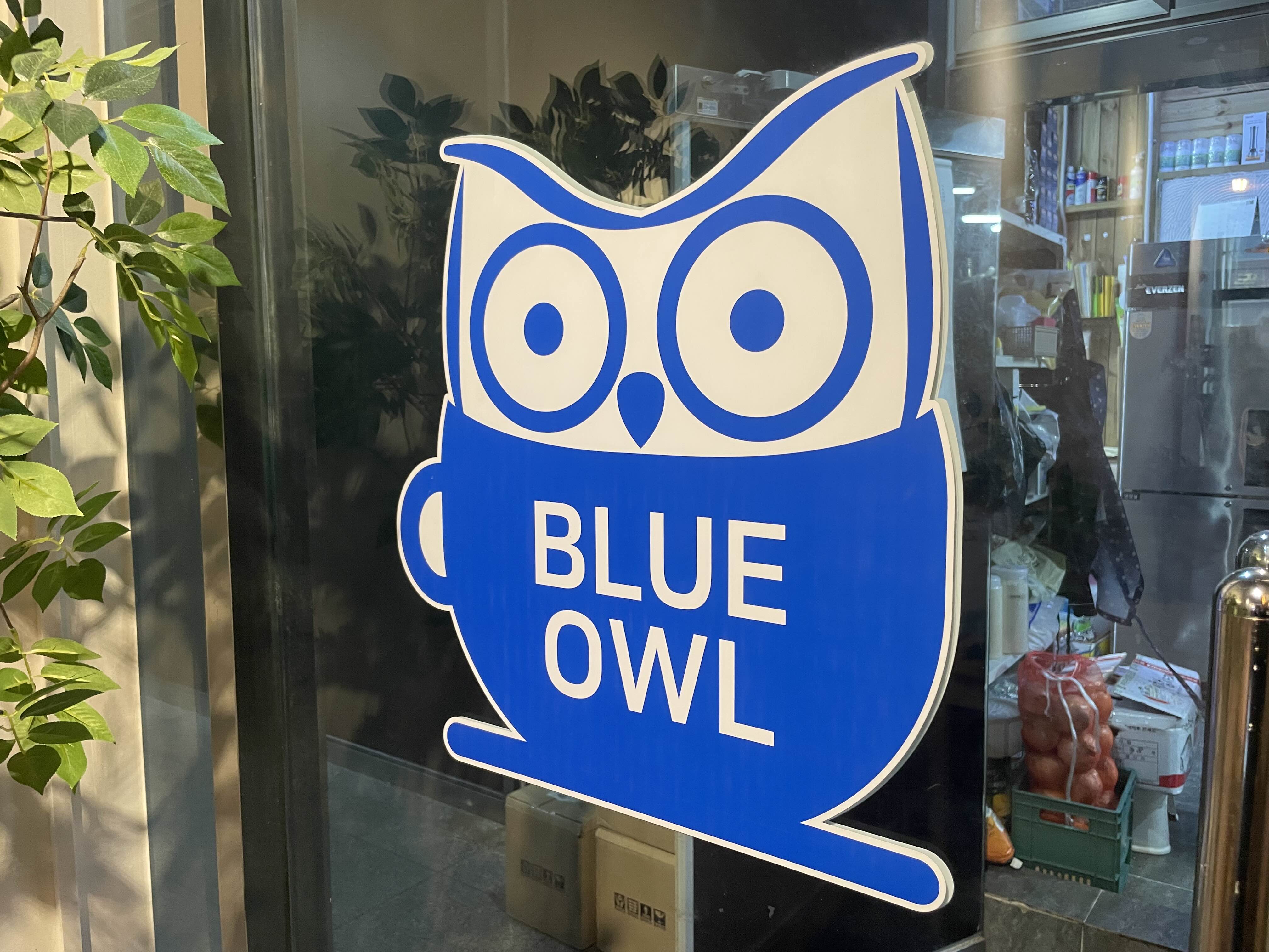 문에 붙어있는 블루아울 마크는 카페이름을 직접적으로 표현해줍니다. 귀엽네요.