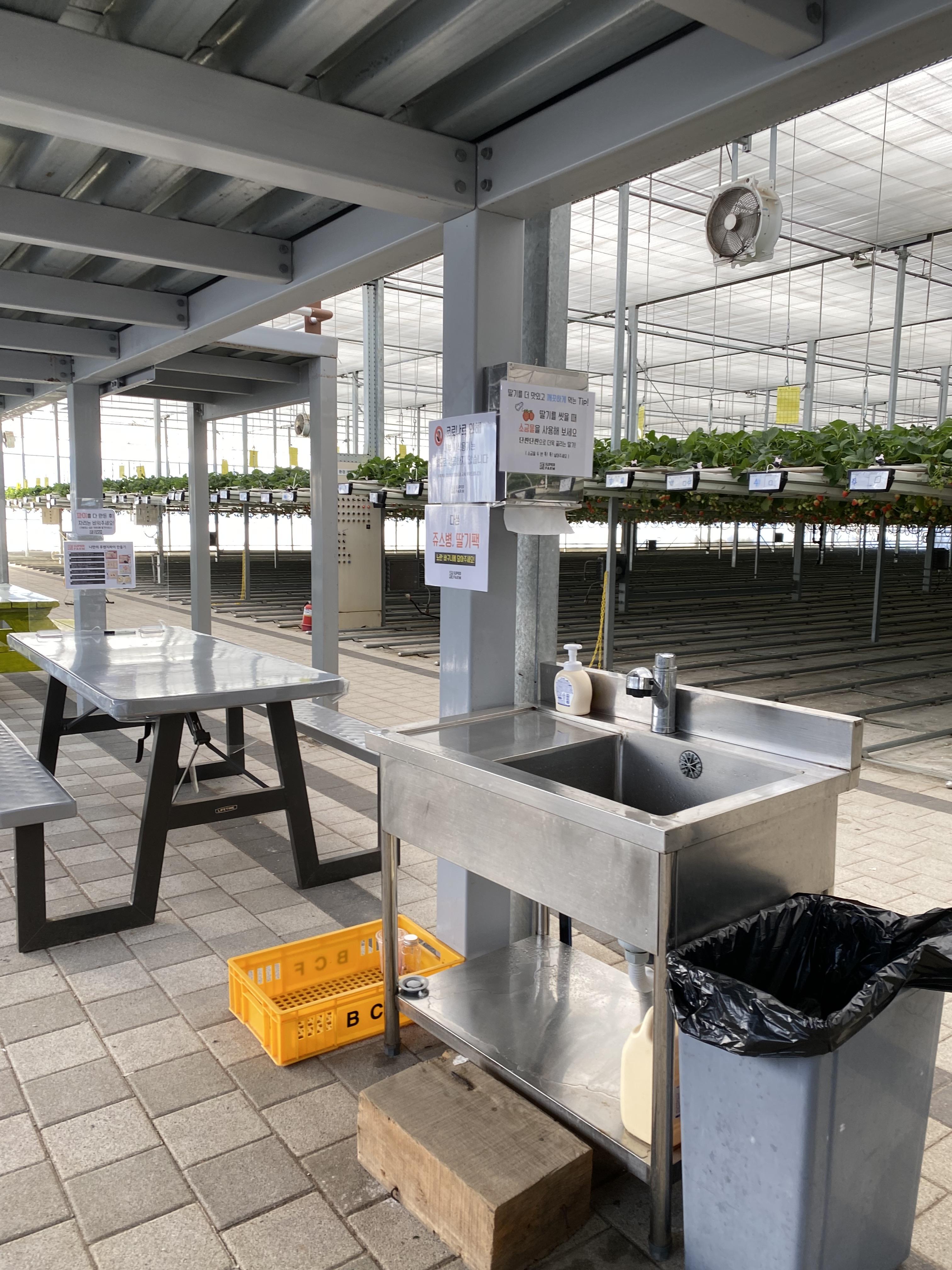 딸기 체험을 하는 곳 옆에는 손을 닦을 수 있는 개수대와 체험을 할 수 있는 테이블이 놓여있습니다. 시설이 굉장히 깔끔하게 잘 관리되고 있습니다. 여러 딸기농장을 가 보았는데 시설은 이곳이 제일 깨끗했습니다.