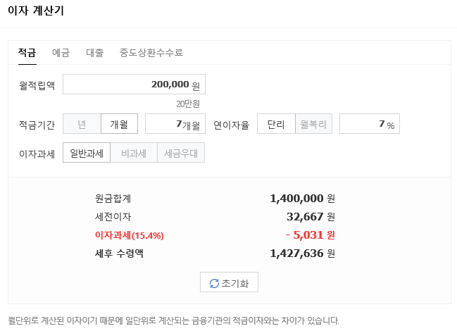 7개월 뒤, 원금 140만원 + 이자 2만 7천원