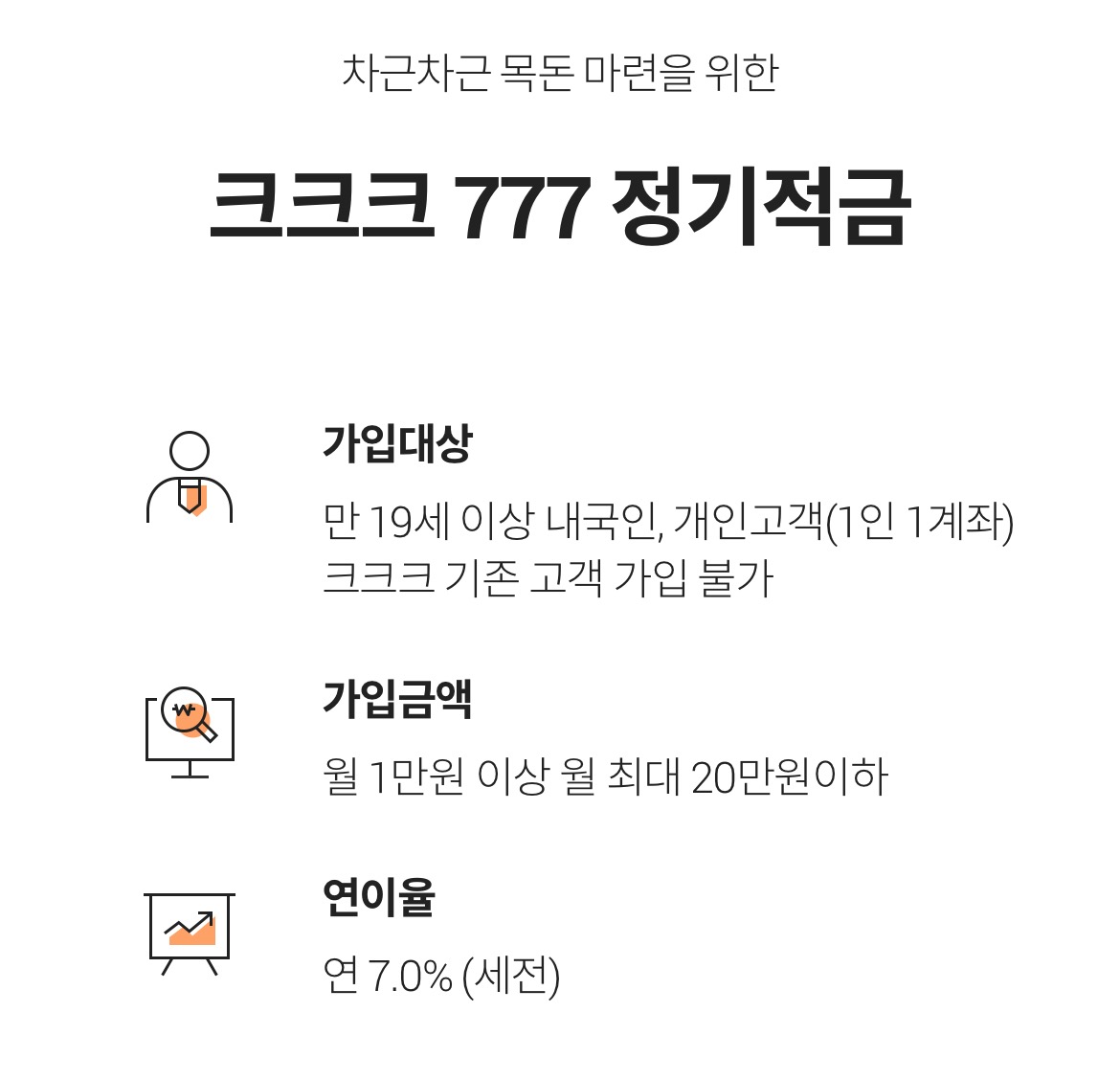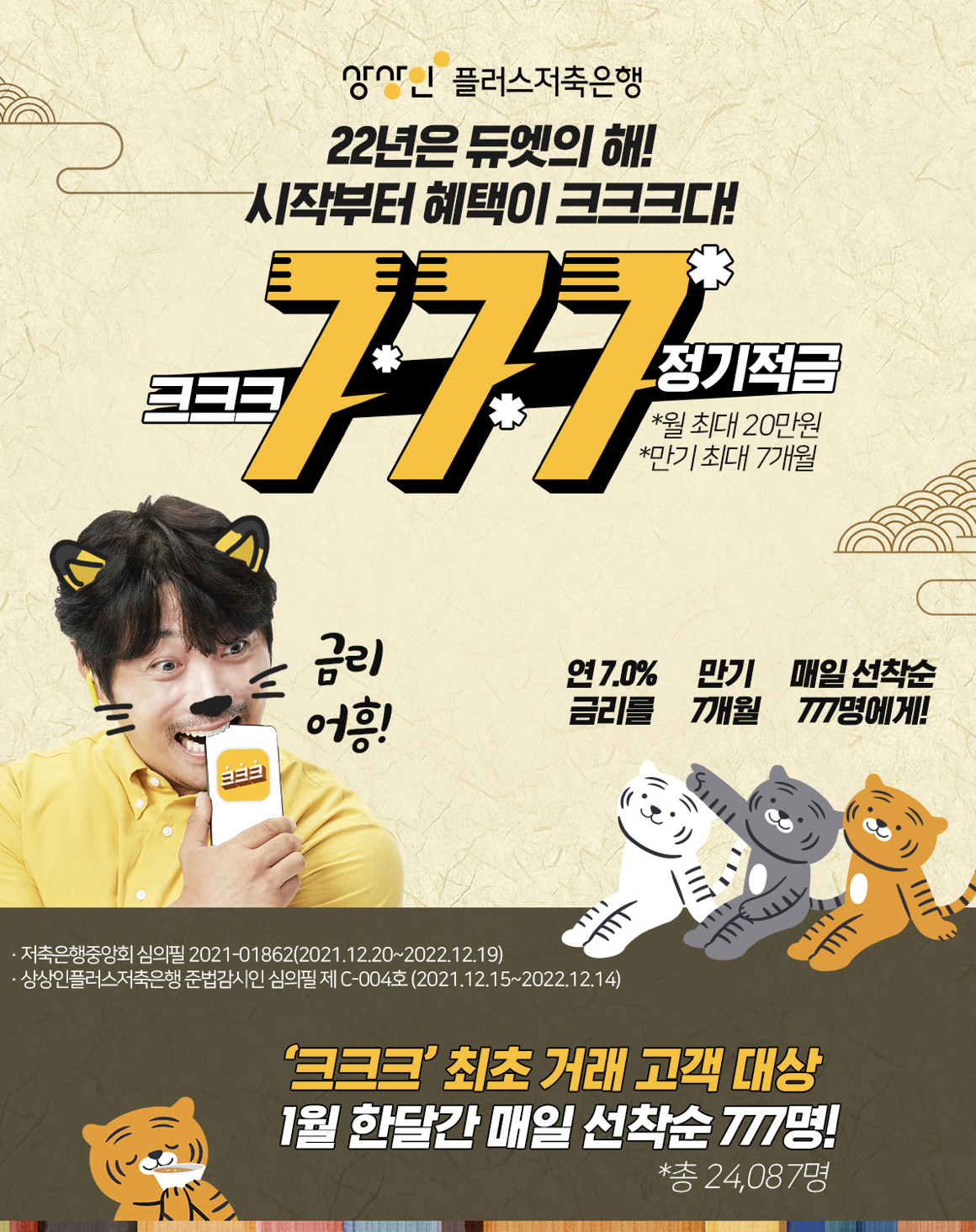 연 7%, 세후 5.22% 수익률을 주는 예금상품이 나왔습니다. 상상인플러스저축은행 크크크777 정기적금입니다. 최대 20만원을 넣을 수 있으며 최초 거래시 지급합니다. 1월 31일까지 매일 777명을 선착순으로 모집합니다.