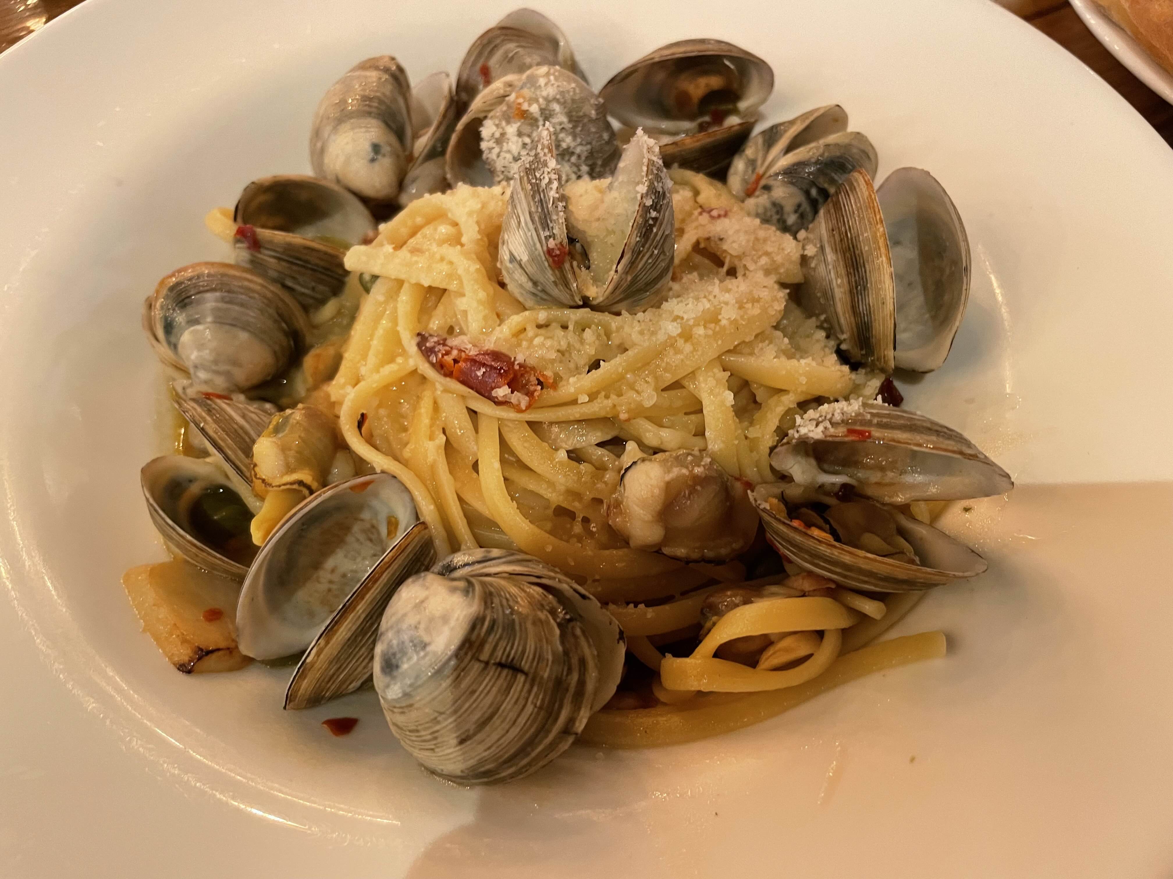 런치메뉴로 봉골레 링귀니 파스타를 시켰습니다. 넓은 면과 바지락이 듬뿍 올라가 있습니다. 약간 매콤하면서 짭짤하고 고소한 맛이 느껴지는 게 시키길 잘했다 생각했습니다.