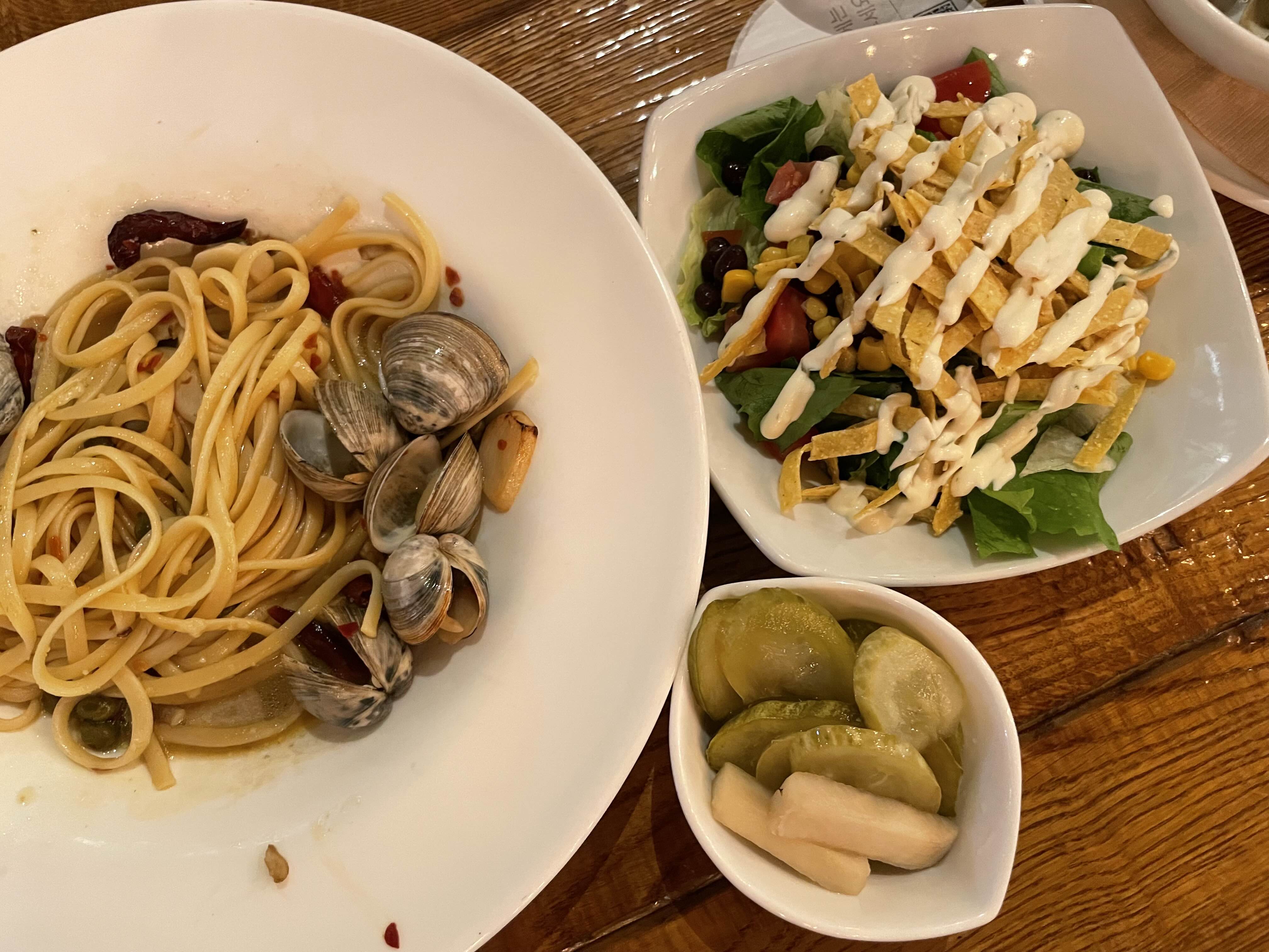 오늘의 런치 세트를 오늘의 런치셀러드와 봉골레를 고르면 이렇게 나옵니다. 샐러드는 나쵸가 듬뿍든 샐러드가 나왔는데 나쁘지 않았습니다.