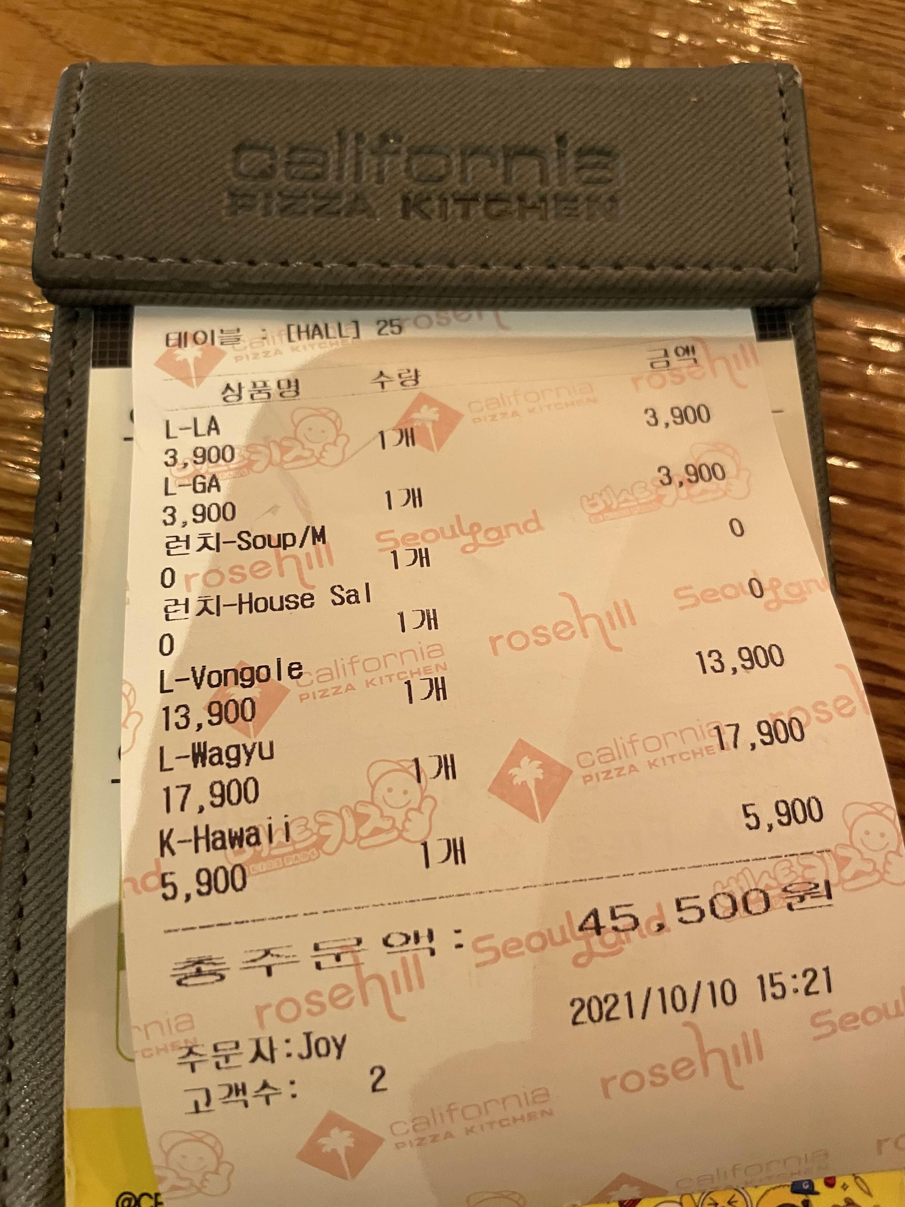 피자에 스테이크, 봉골레 파스타, 스프, 샐러드와 에이드 두 잔을 먹었는데 4만 5천 5백원이면 가격도 상당히 훌륭하다고 볼 수 있죠?