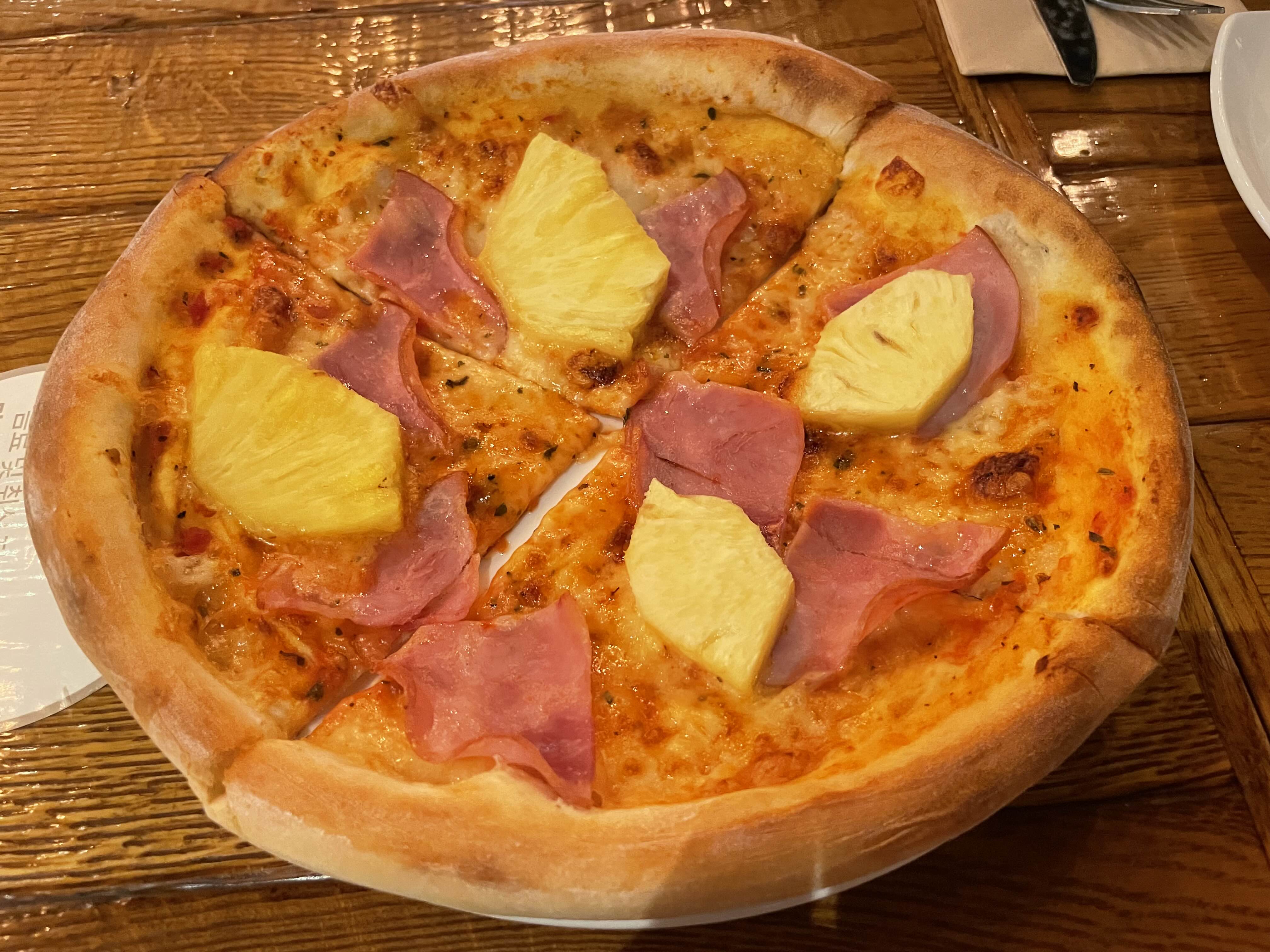 아이를 위한 작은 피자도 한판 추가했습니다. 위에 파인애플 토핑이 올라간 하와이안스타일의 미니 피자입니다. 아이들은 이정도 피자만 시켜줘도 실컷먹을 수 있을 정도의 양입니다.