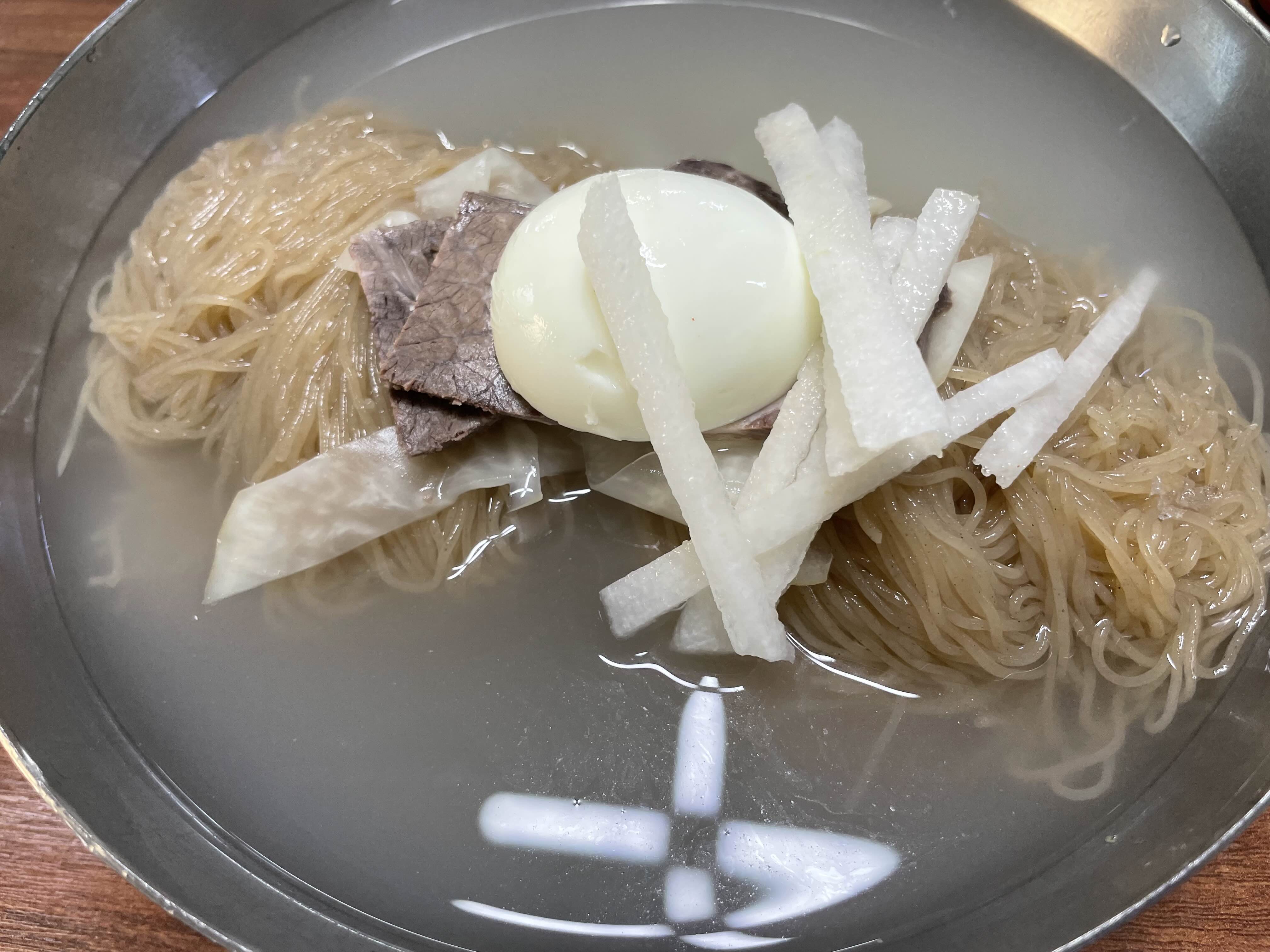 배와 수육, 계락이 올라가 있습니다. 여느 평양냉면집에서 보는 것과 같지만 국물이 허여멀겋습니다. 슴슴하다 심심하다는 맛을 느끼려면 이곳의 평양냉면을 먹어봐야합니다. 냉반이라고 밥을 말아 주시도 하신다는데 저는 면을 좋아하기 때문에 냉면을 먹었습니다. 사실 이런 심심한 국물에 밥을 말아 먹는 다는 것이 잘 상상도 안되기도 합니다.