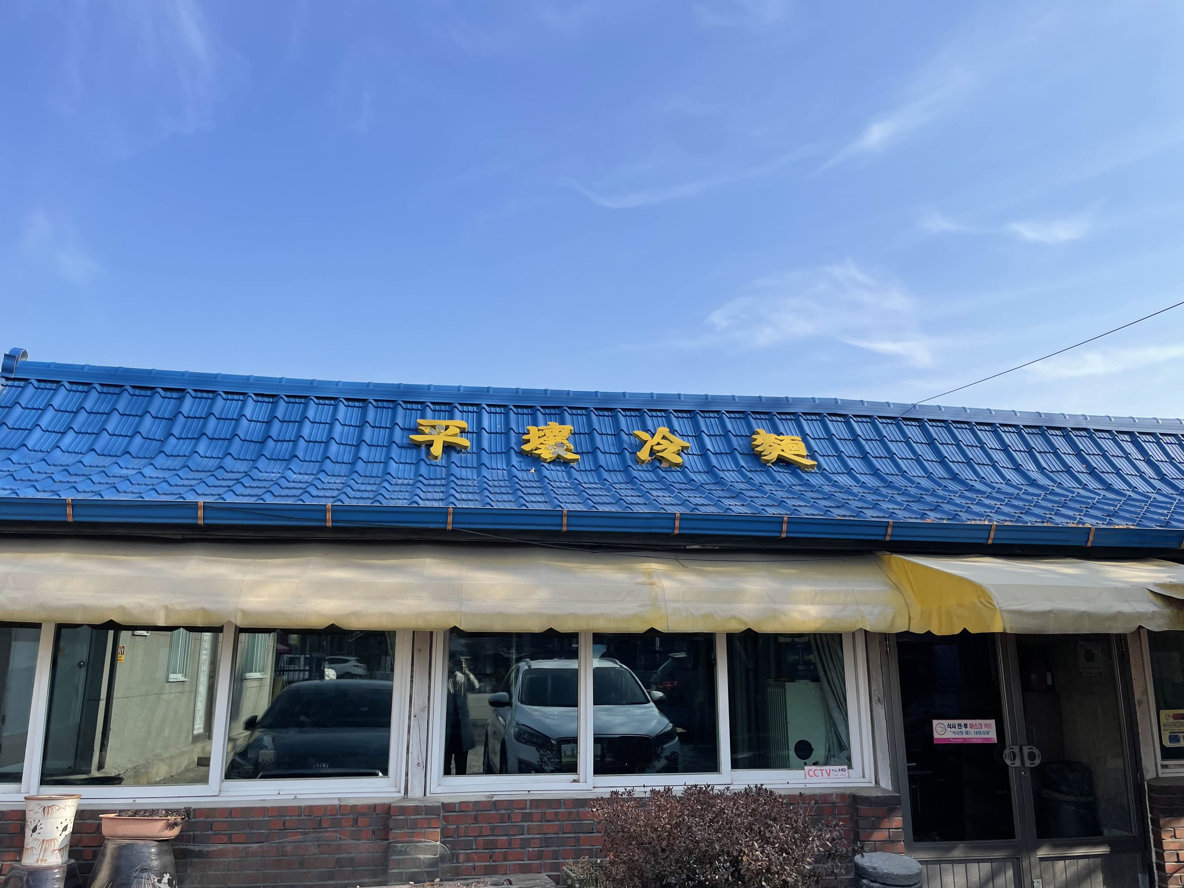 간판은 심플합니다. 춘천의 평양냉면집을 아는 사람들은 파란지붕 냉면집이라고 부릅니다. 파란 지붕과 파란 하늘이 사진을 찍으면 잘 나옵니다. 노란색 한자로 씌여있는 간판을 보면 이 가게의 업력이 오래되었다는 것을 새삼 느끼게 해줍니다. 이곳에서만 70년 넘게 운영한 노포입니다.