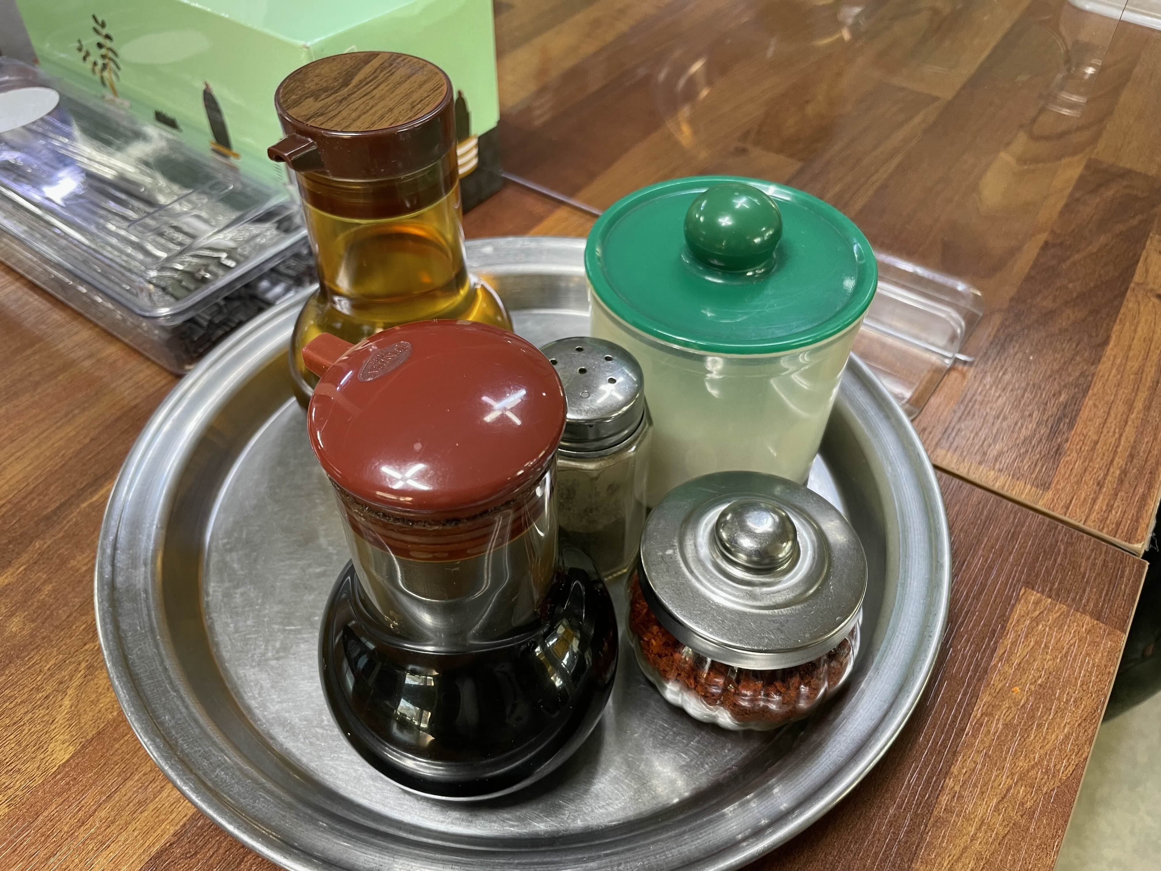 오랜된 가게에서 볼 수 있는 레트로 양념통입니다. 요새는 깔끔한 양념통을 많이 쓰지만 이곳은 오래된 가게 답게 정겨운 디자인의 양념통을 씁니다. 간장과 식초, 그리고 후추, 고추가루가 있습니다. 겨자는 쉽게 쉬는 재료인지라 냉면을 시키면 따로 나옵니다.