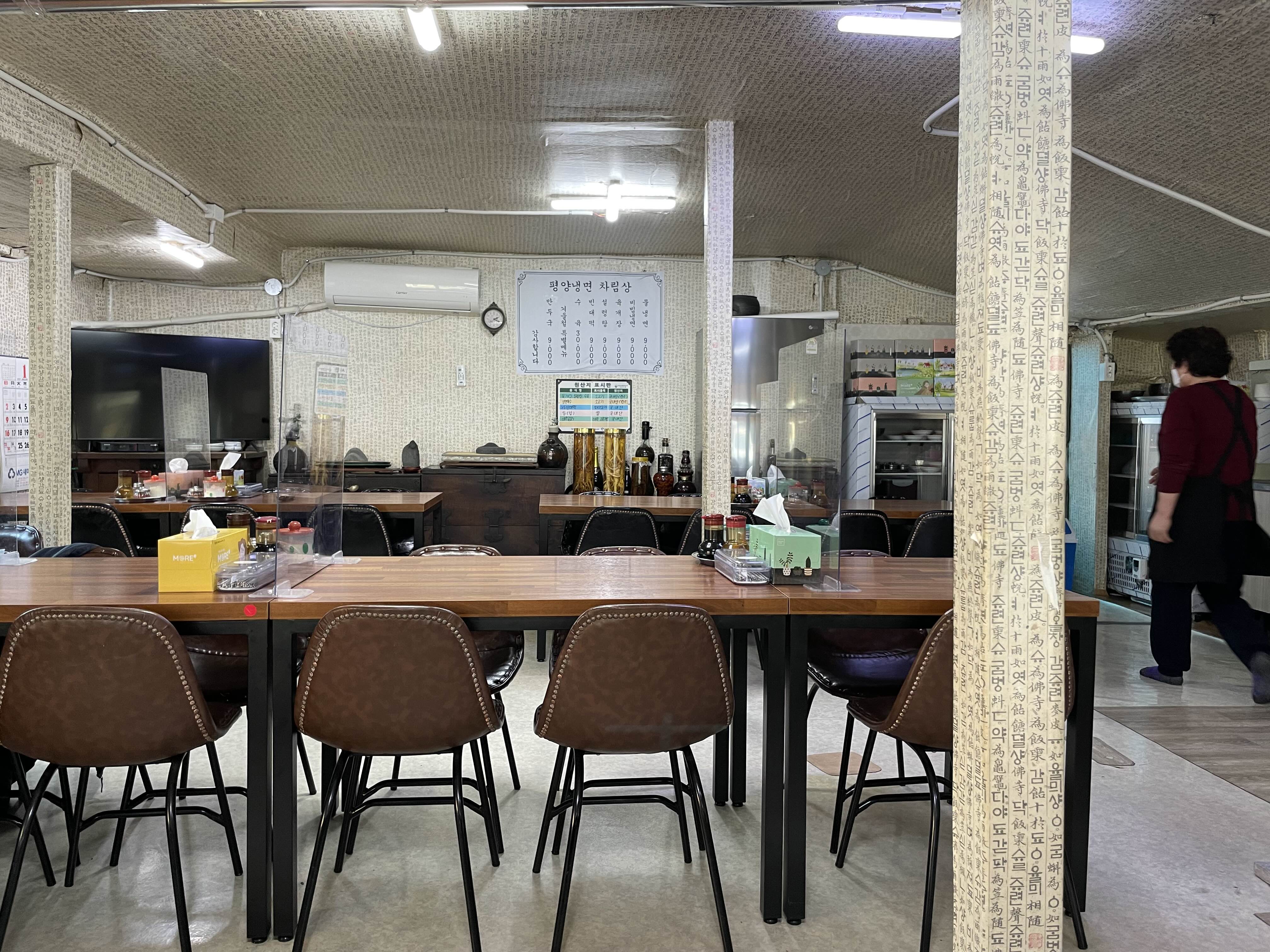 가게는 입식입니다. 옛날에는 좌식이었을 법한 구조입니다. 벽에는 옛 한글이 써있는 벽지가 발라져 있고 맞은편에는 메뉴판이 보입니다.